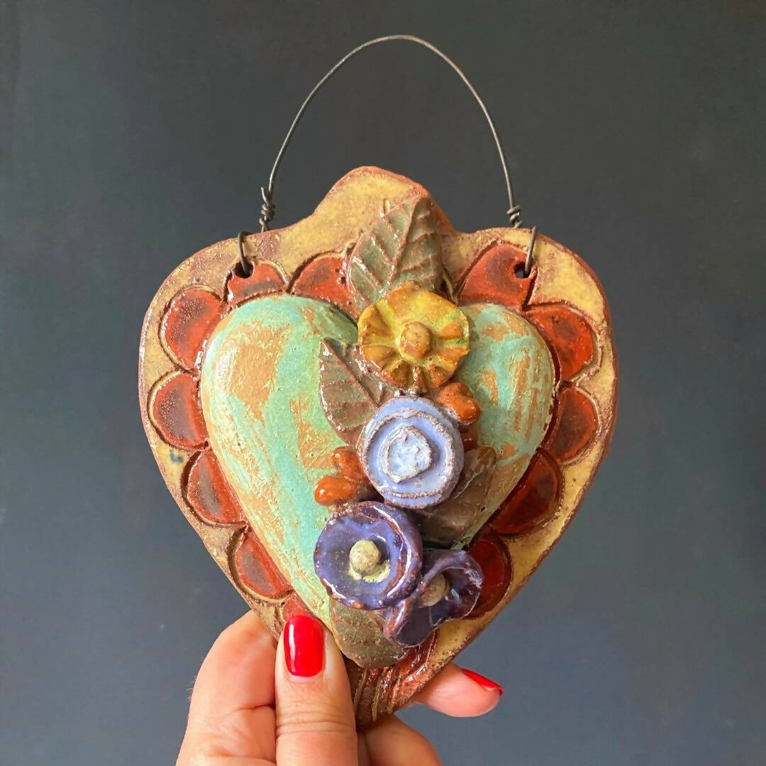 Hecho a mano de greda y esmaltado, con alambre rústico para colgar.