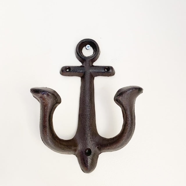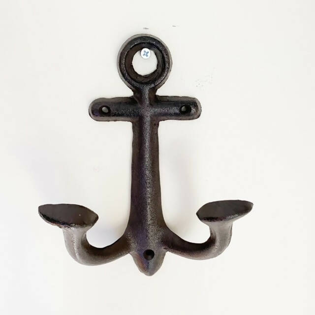 Perchero de hierro con forma de ancla y dos ganchos, proporcionando una solución práctica y decorativa.