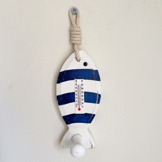 Perchero con forma de pez y un termómetro integrado, añadiendo un toque marino y funcional a la decoración.