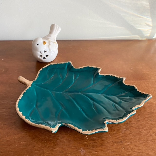 Un plato de cerámica con un exquisito diseño de hoja de plátano oriental en tonos verdes y dorados. Perfecto para dar un toque de naturaleza y elegancia a tu mesa.