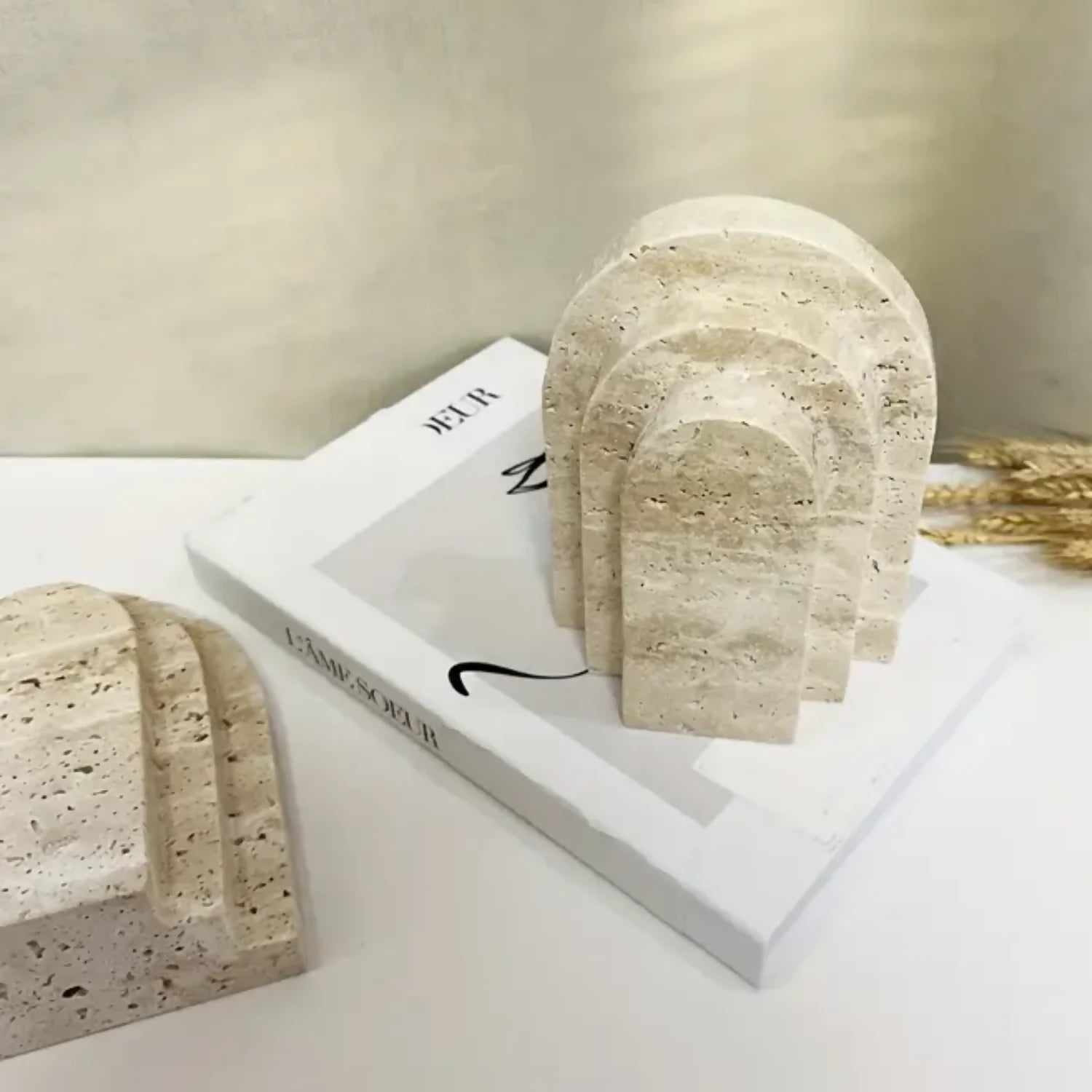 Con una estética inspirada en la arquitectura clásica y elaborados en material tipo piedra, estos sujetalibros aportan textura, carácter y un aire sofisticado a cualquier estantería o escritorio. Sus tonos neutros en crema los hacen versátiles y combinables con estilos nórdico, wabi sabi y minimalista.