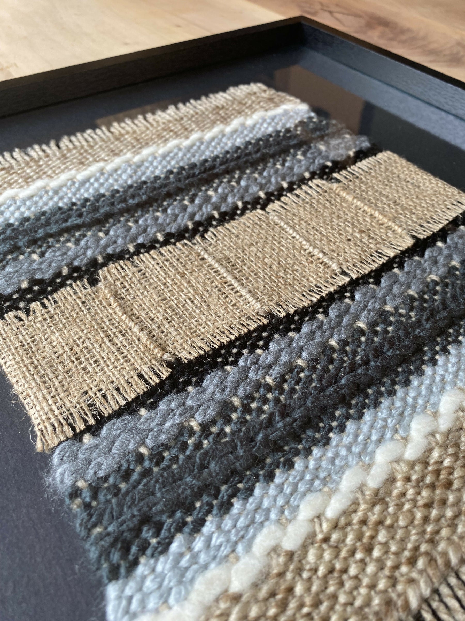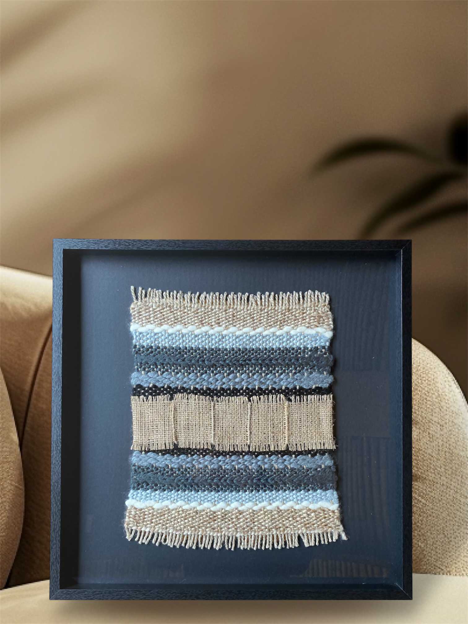 El telar esta fabricado a mano, con fibras naturales, enmarcado en madera con cubierta de vidrio para mayor protección. El Telar Arena es de 40x40cm.