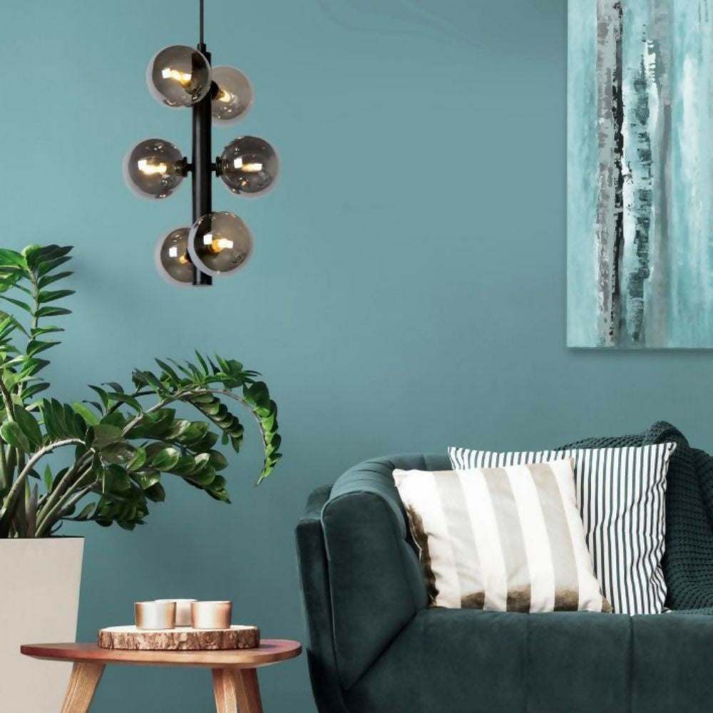 Dale un toque festivo permanente a tu interior. Esta lámpara colgante utiliza vidrio real para un resultado elegante. Los puntos de luz son seis esferas, unidas a la barra de acero en pares. Las diferentes direcciones de los pares de esferas enfatizan el lado único. Desde detrás del cristal oscurecido, las seis luces esparcen su luz. El resultado: un brillo cálido para todo tu espacio. Es ajustable en altura y fácil de conectar a un atenuador.