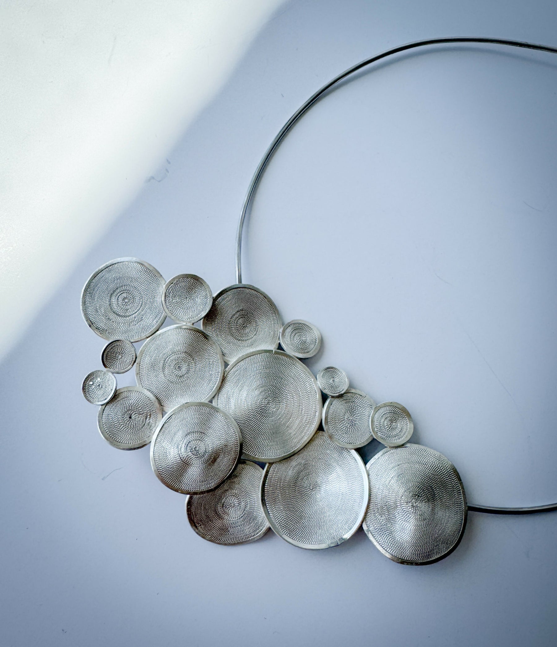 Este collar es una constelación de círculos tejidos a mano, donde cada espiral de filigrana en plata parece guardar un secreto en su interior. Dispuestos en una composición orgánica y armónica, los discos evocan gotas, memorias o planetas que orbitan suavemente sobre la piel.