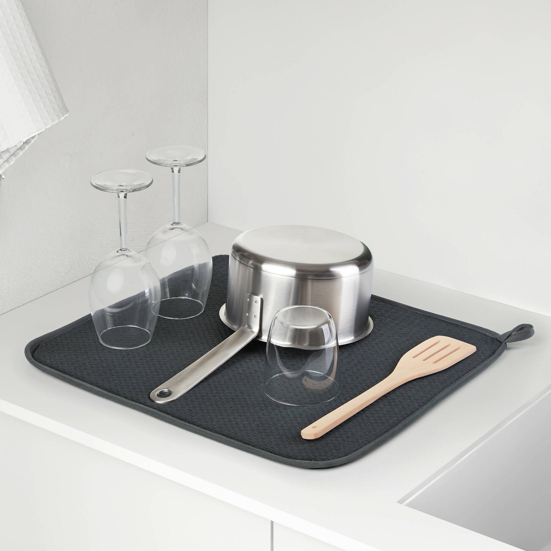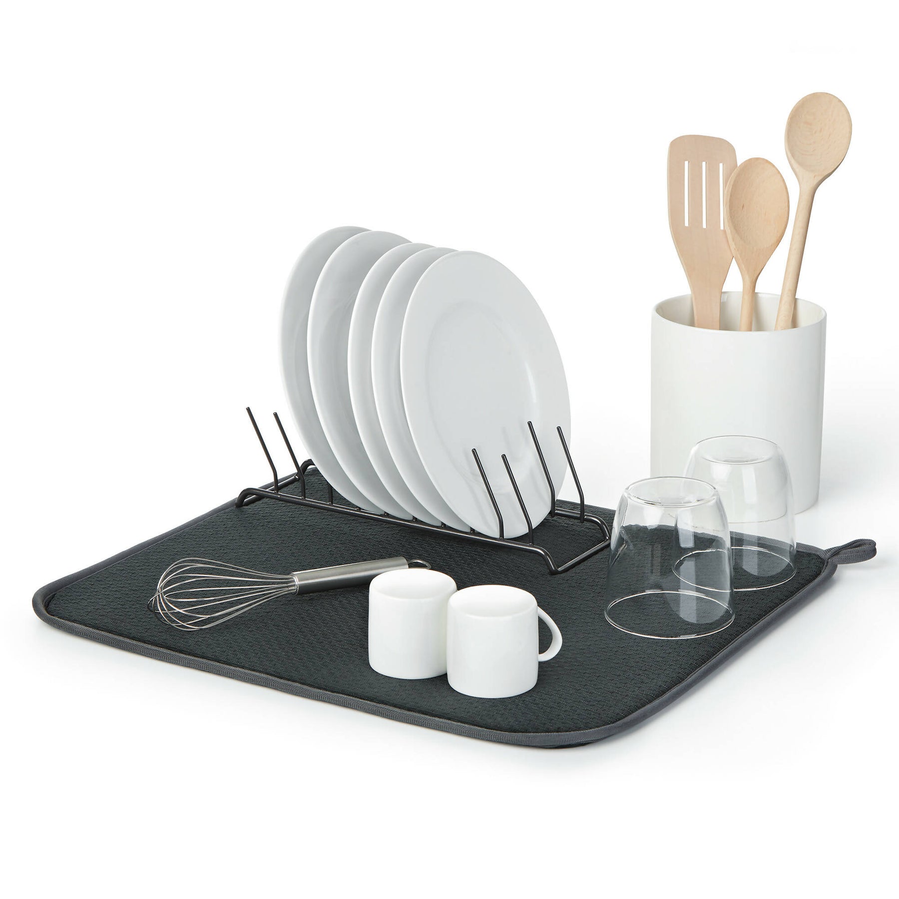 Úsala junto a tu lavaplatos o directamente sobre la encimera para secar tu loza, cristalería o utensilios de cocina. Su tamaño compacto la hace perfecta para cualquier cocina. Cuando no la estés usando, cuélgala discretamente gracias a su práctico gancho.