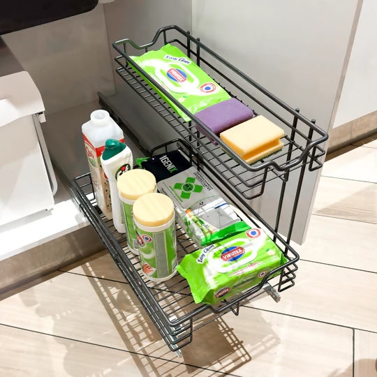 Organiza todas las cosas que van bajo el lavaplatos o bajo el lavamanos del baño, fácilmente con este organizador que tiene una forma especial para no topar con el sifón 😉. Lo puedes instalar para ambos costados, derecho o izquierdo.