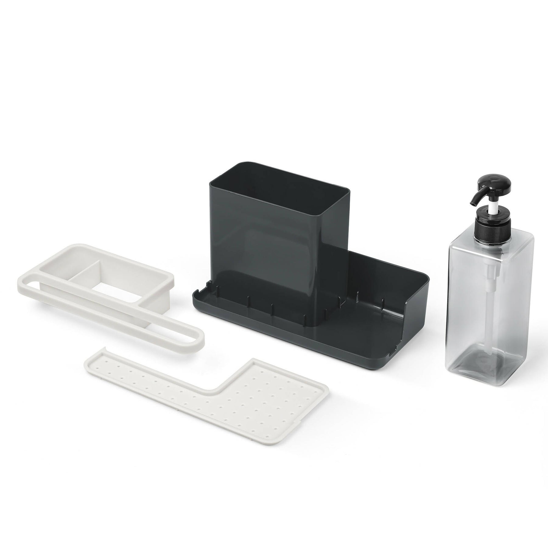 Barra frontal para colgar el paño de limpieza. Incluye dispensador de jabon, 600 ml. Varios compartimientos. Medidas: 23,5 x 11,5 x 22,5 cms.