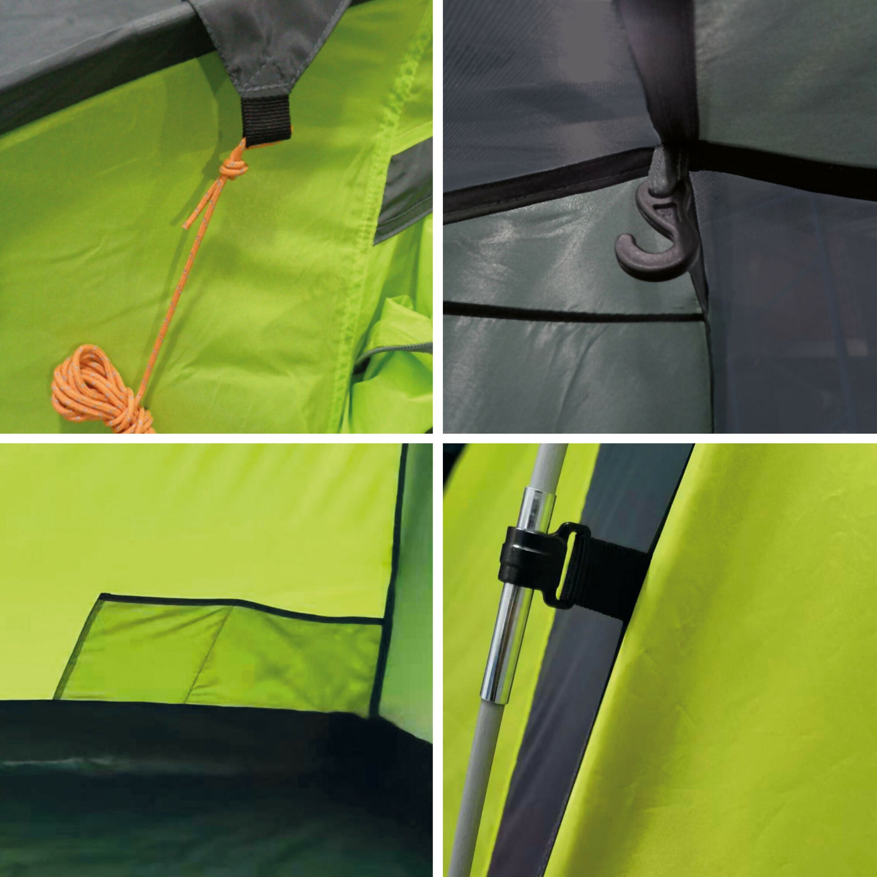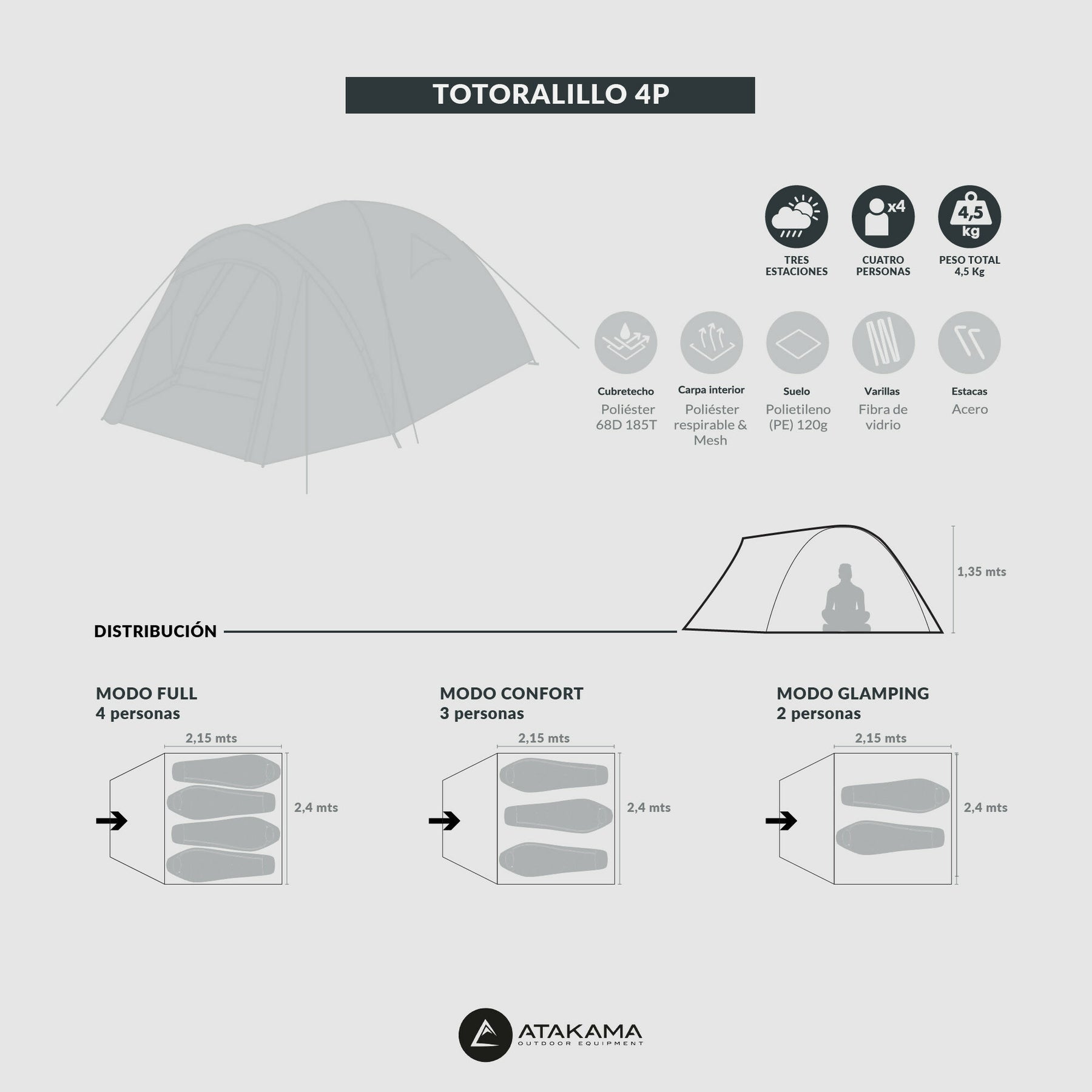 Carpa interior: POLYESTER 185T BREATHABLE ( tejido de poliéster de densidad 185T y tiene propiedades transpirables que permiten el paso del aire a través del tejido)