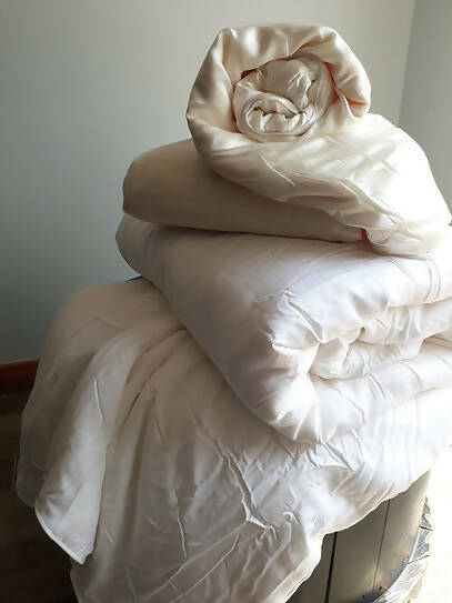 Plumón relleno 100% de seda cubierto con forro 100% de Bambú.