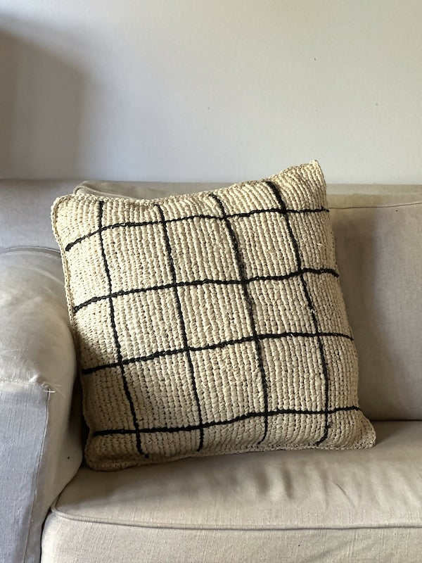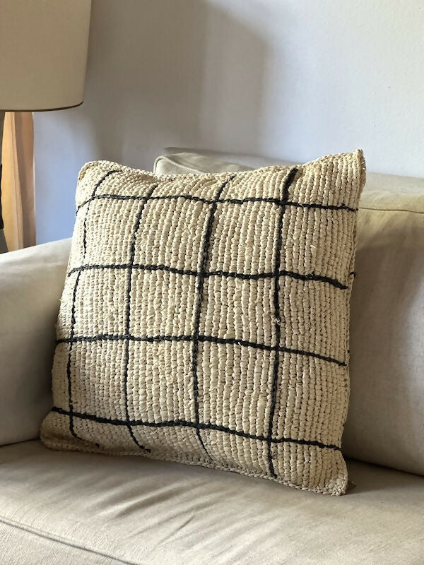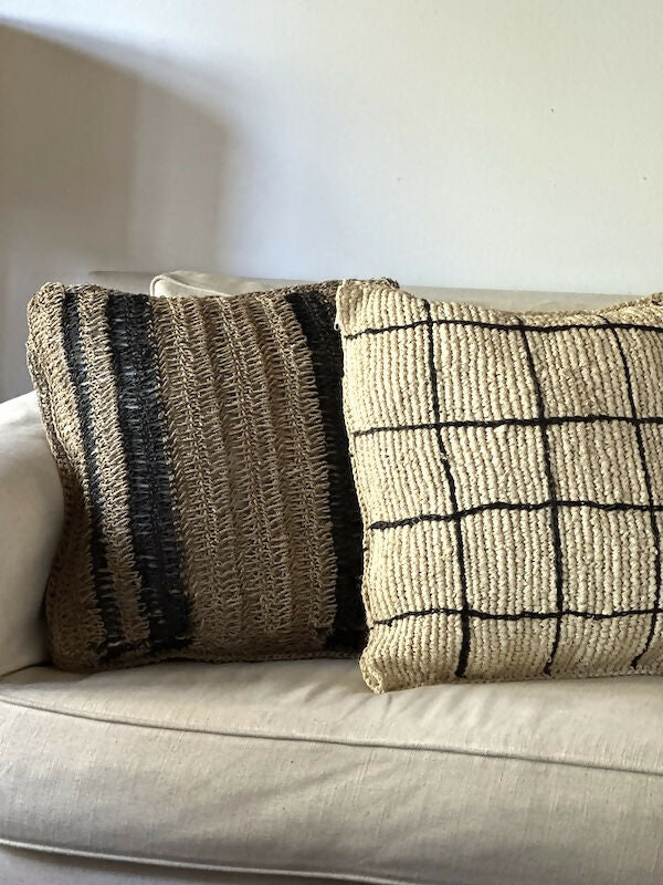 Añade un toque de estilo natural y elegante a tu hogar con el cojín de raffia con líneas negras de Casa África. Este cojín, tejido a mano con fibra natural de raffia, aporta calidez y textura a cualquier ambiente.
