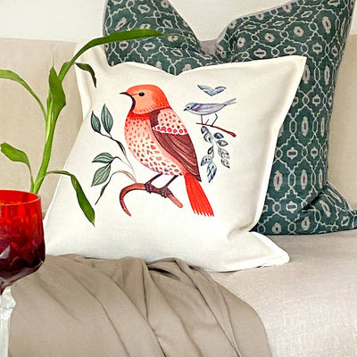 Cojín Zorzal Rojo en linet (poliéster) estampado 45 x 45 cm.