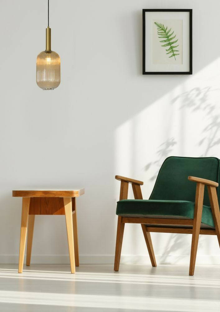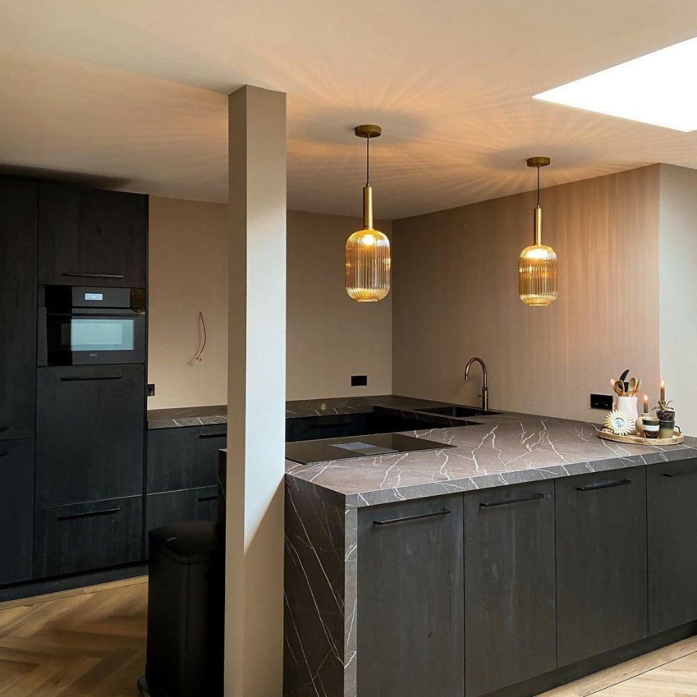 ¿Un acento retro en tu interior? No busque más. Con este modelo has encontrado una lámpara colgante que aporta ambiente y color a tu hogar además de un toque retro. El conjunto luce elegante gracias a la pantalla de vidrio cilíndrica, acentos dorados y un diseño sofisticado. Combina la versión ámbar y verde para un efecto único. La lámpara colgante es regulable en altura, de 50 a 150 centímetros.