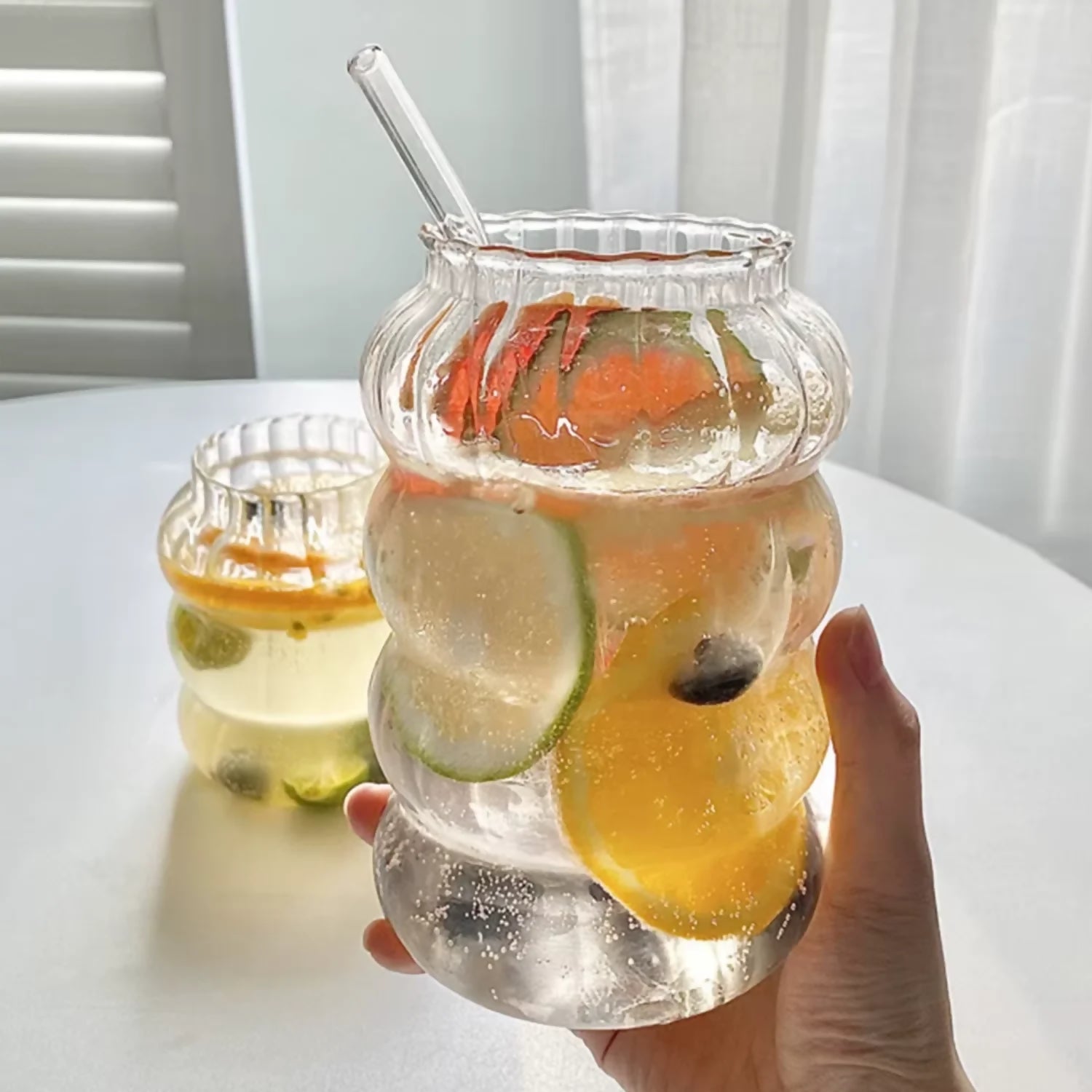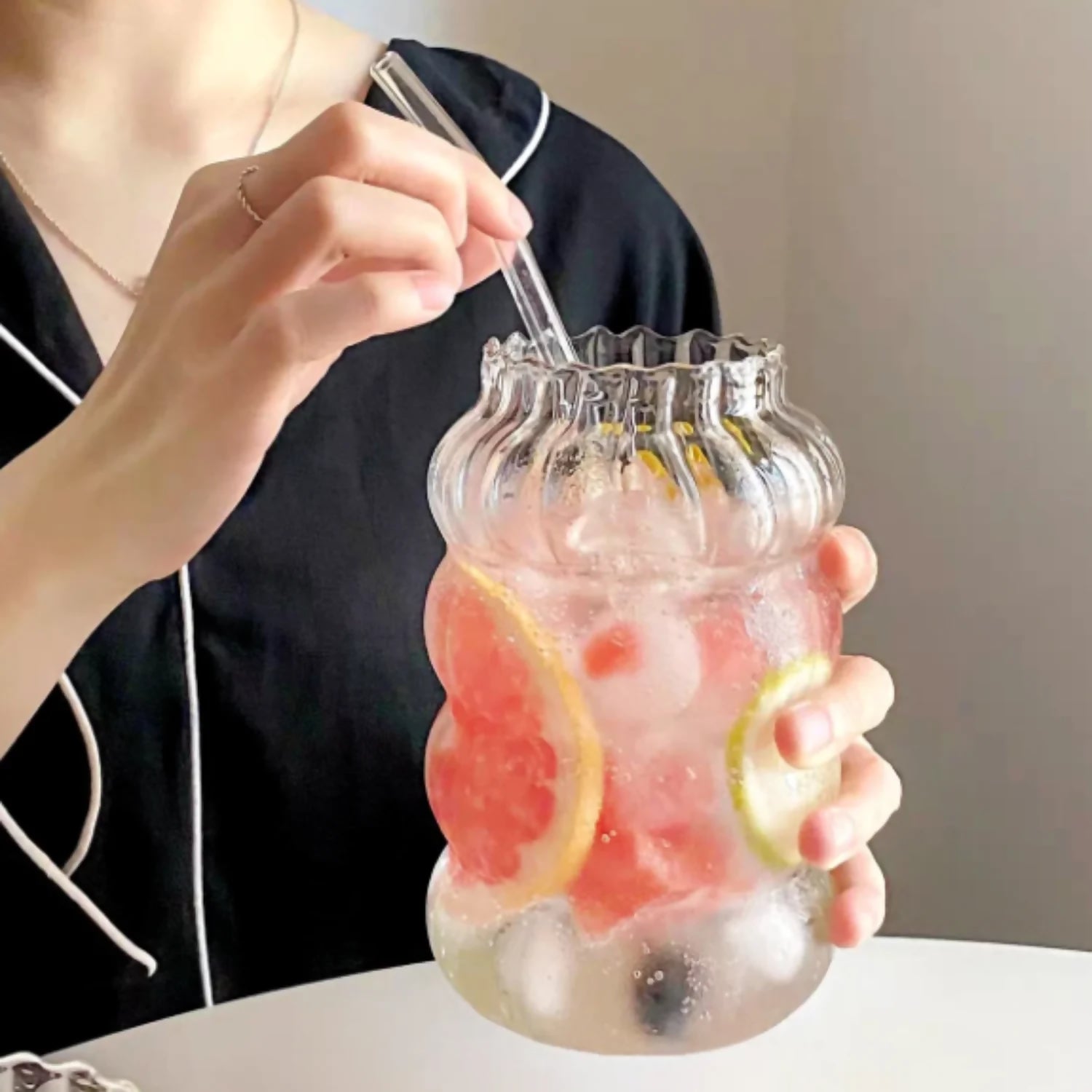 Disfruta de tus bebidas favoritas con el Vaso Relieve con Bombilla de Vidrio