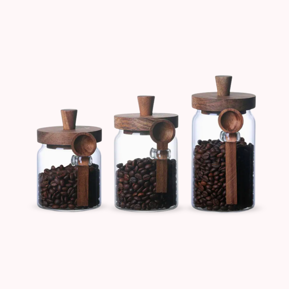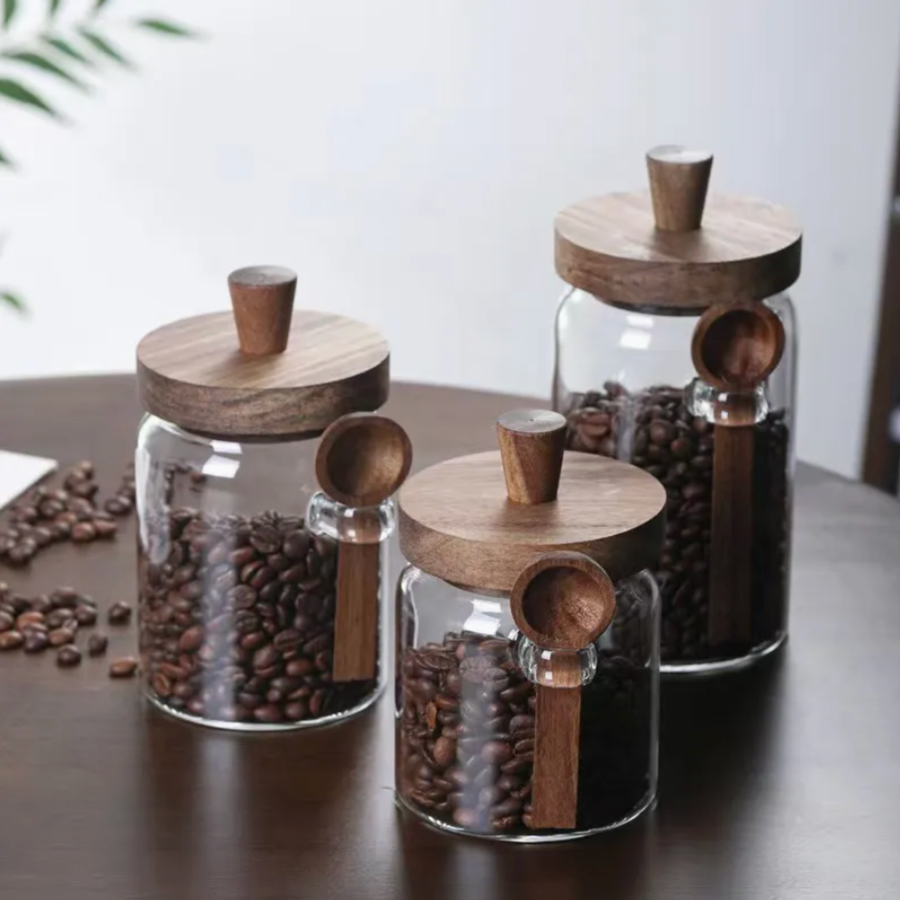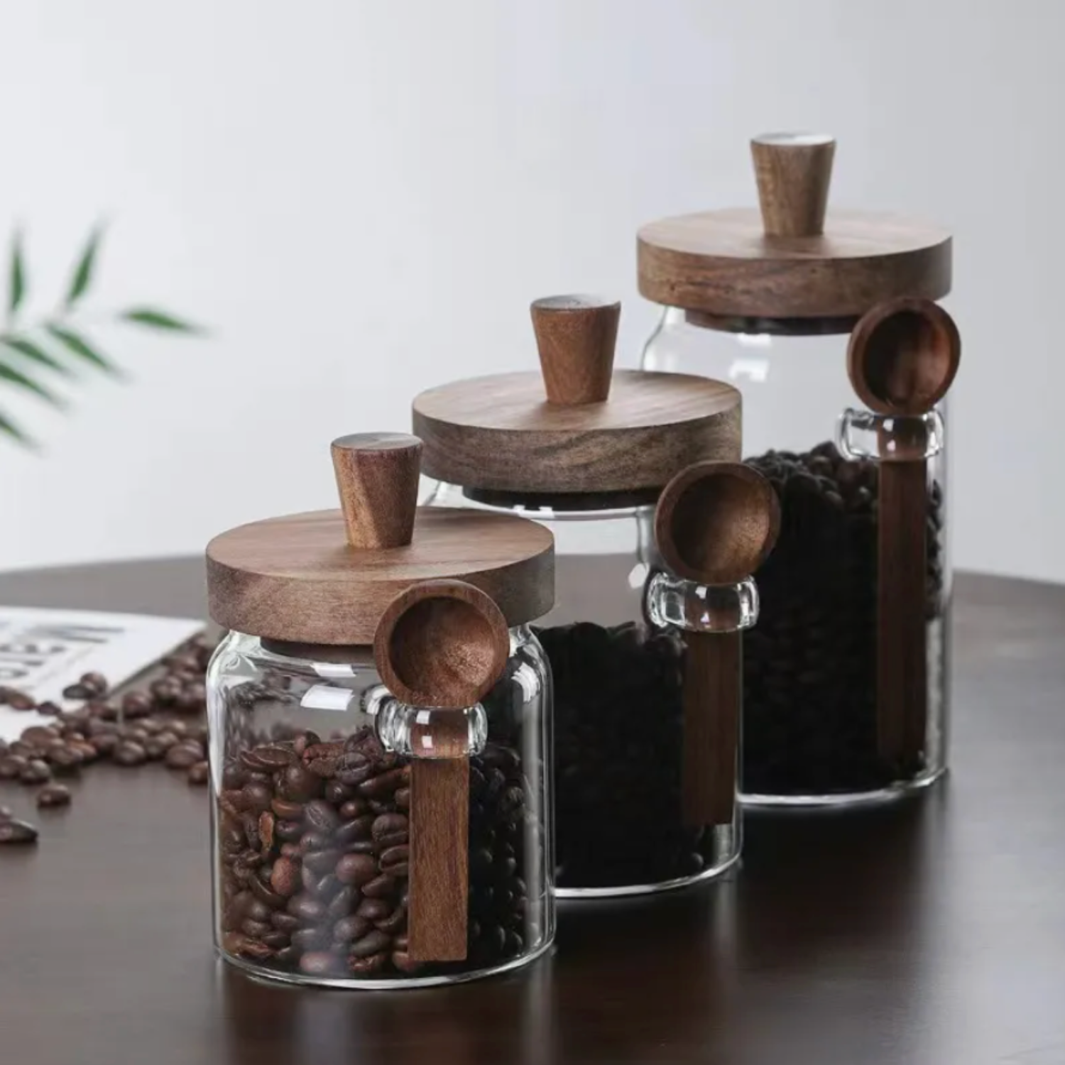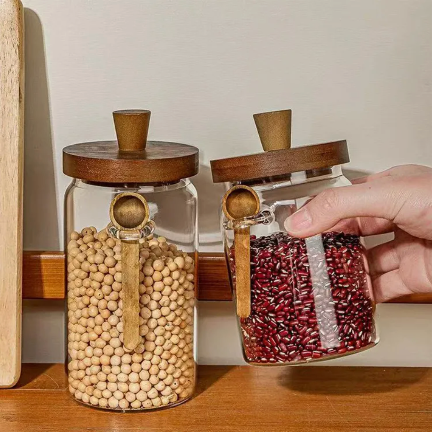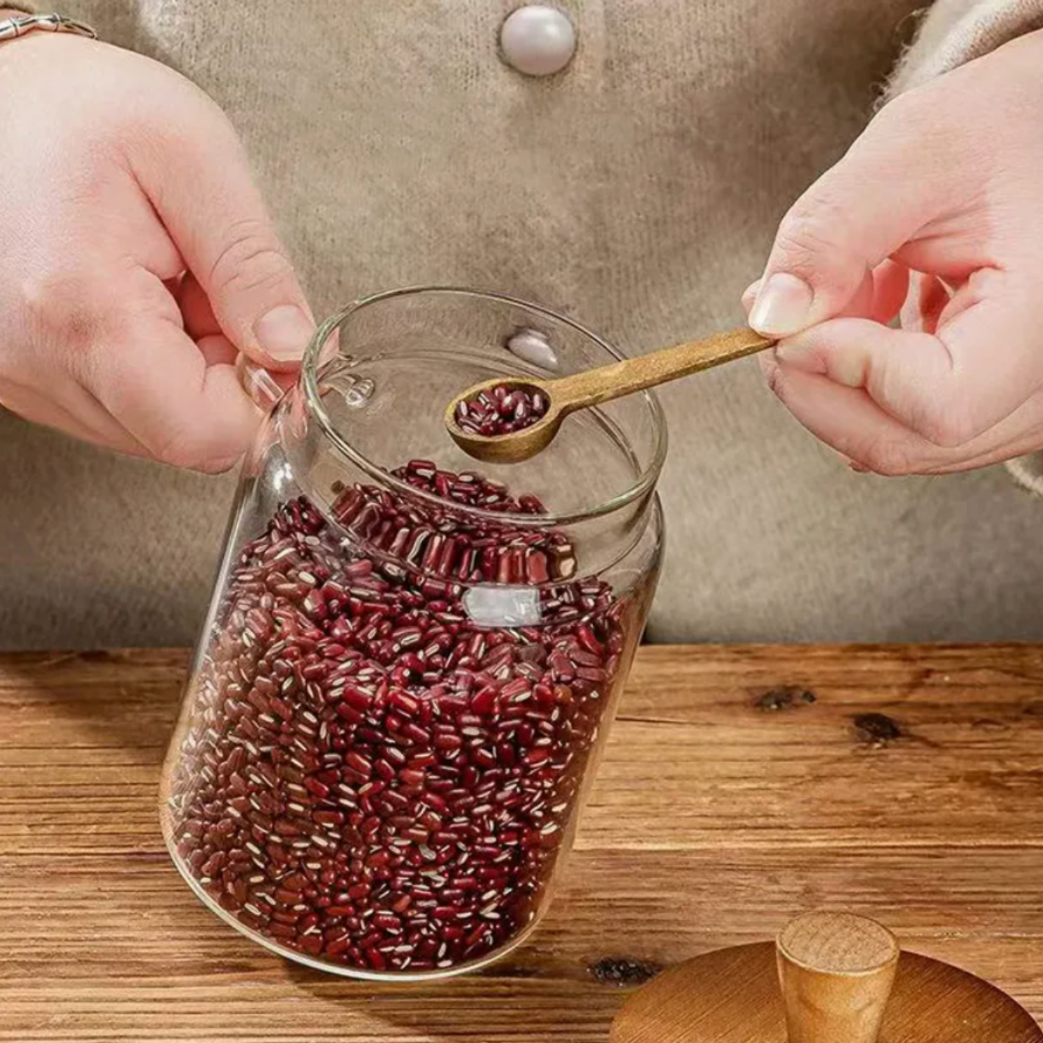 Set de 3 Contenedores de Vidrio con Tapa de Madera y Cucharita