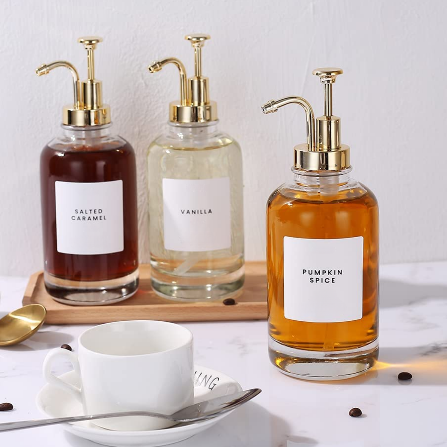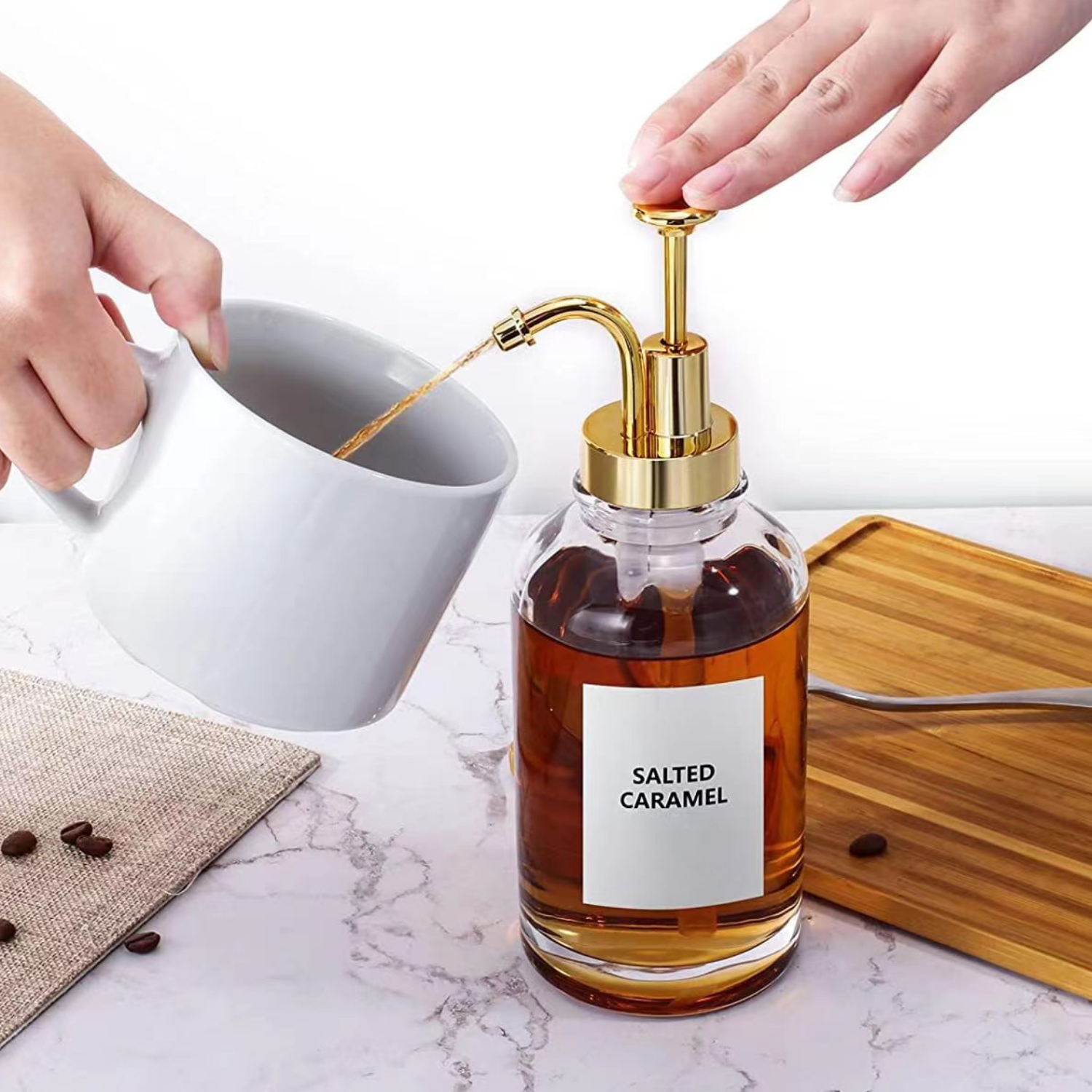 Inspirados en la popular tendencia del Coffee Bar en casa, estos dispensadores son perfectos para organizar y servir jarabes o esencias aromáticas durante tus momentos de café, brunch o reuniones. Además, su diseño versátil los hace ideales para otros espacios del hogar, como el baño, donde pueden utilizarse para jabón líquido, shampoo, acondicionador o cremas.