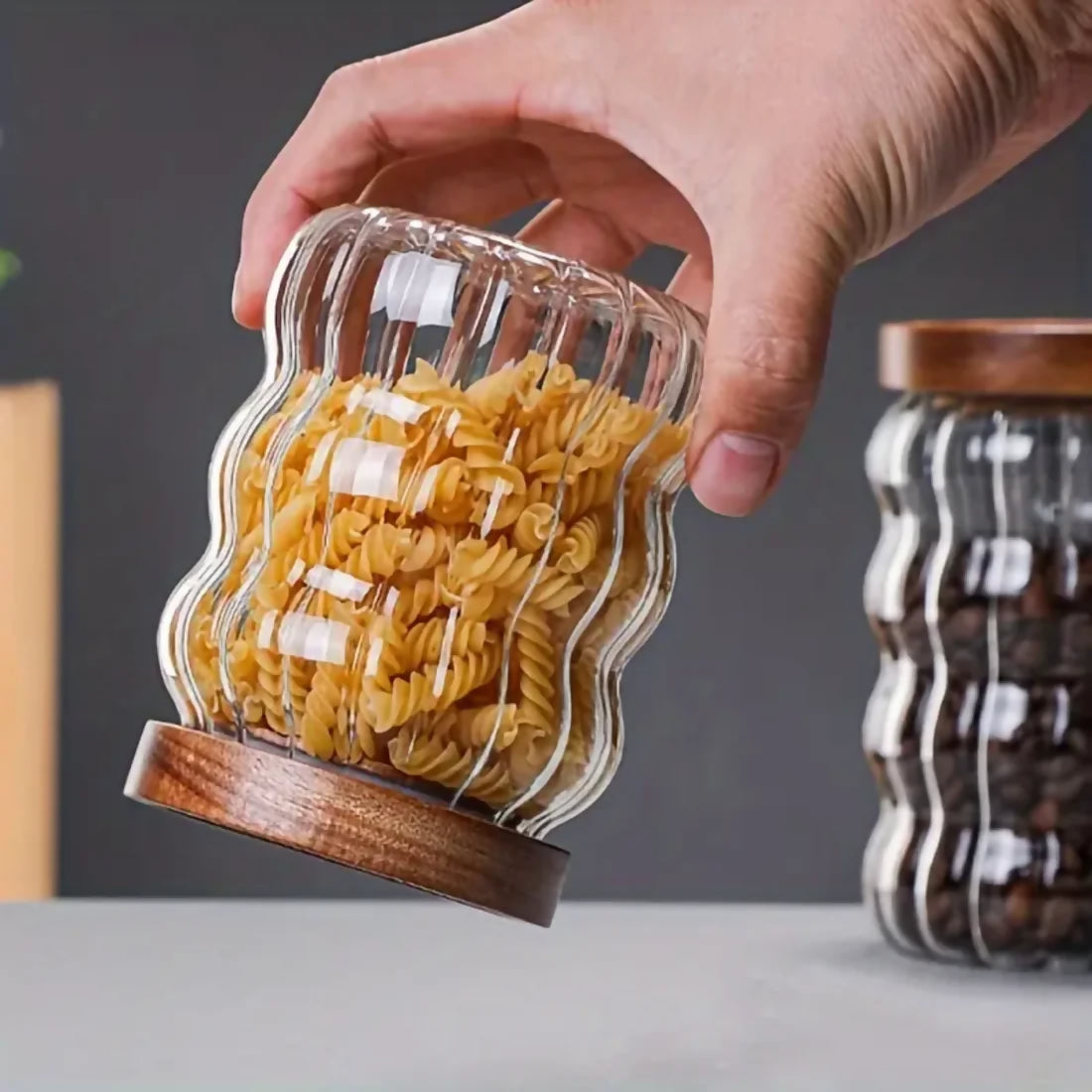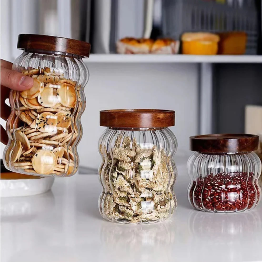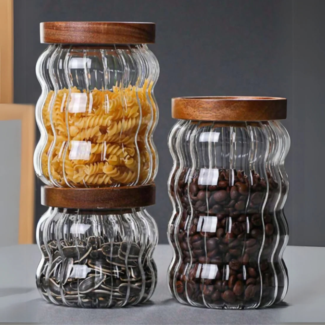 Cada set incluye tres frascos de diferentes capacidades: 750 ml, 550 ml y 350 ml, perfectos para almacenar condimentos, dulces, frutos secos, especias y mucho más. Fabricados en vidrio resistente de alta calidad, estos frascos cuentan con un atractivo diseño decorativo de rayas y ondas, que añade un toque moderno y sofisticado a cualquier espacio. Sus tapas de madera natural están equipadas con un anillo de goma de silicona hermética, garantizando una conservación óptima del contenido y evitando la entrada de aire y humedad.