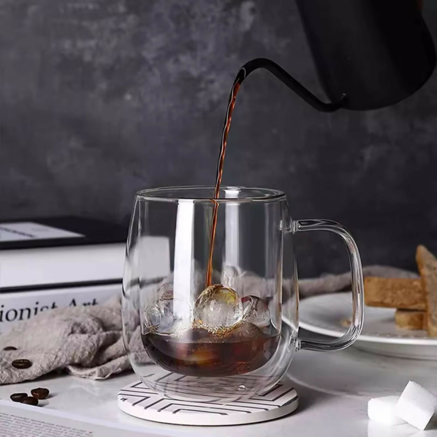 Capaz de evitar la transpiración por condensación, conservando tu superficie de trabajo limpia y sin manchas. Con una capacidad de 350 ml, es ideal para tu café matutino, té, chocolate caliente o cualquier bebida que prefieras. También es perfecta para cócteles, bebidas frías e incluso servicio de postres. Su diseño transparente y elegante despertará tus sentidos. Apta para lavavajillas o lavado a mano.
