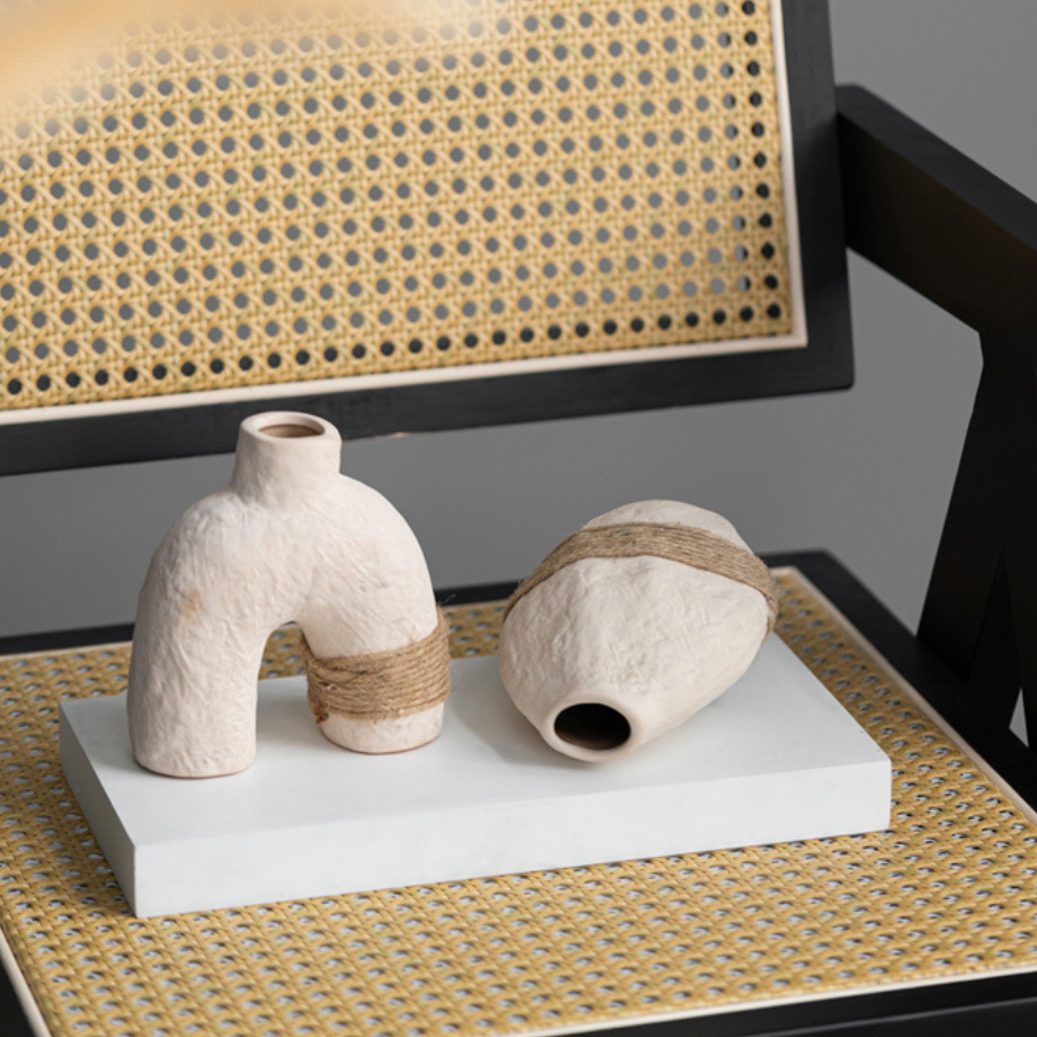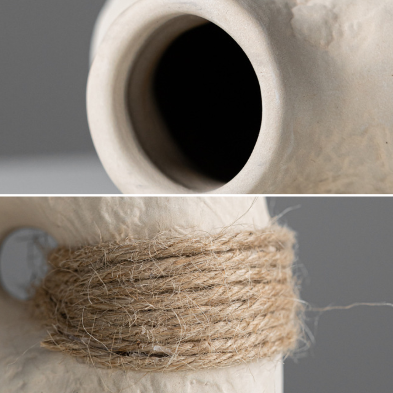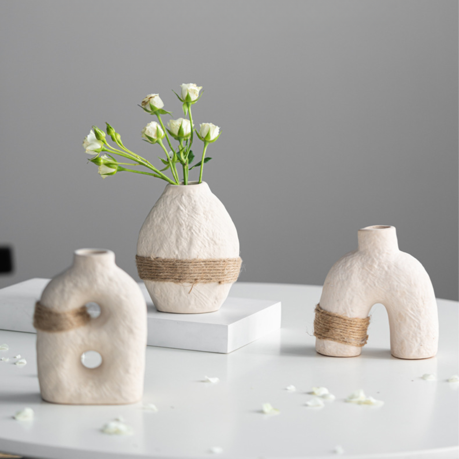 Lleva la belleza de lo artesanal a tu hogar con el Set de 3 Floreros de Cerámica Eco Terra, una colección que combina diseño orgánico, textura natural y elegancia minimalista. Inspirados en la esencia de la tierra, estos jarrones de porcelana blanca destacan por su acabado texturizado y su amarrado de cuerda de cáñamo natural, que aporta un toque cálido y auténtico a cualquier espacio.