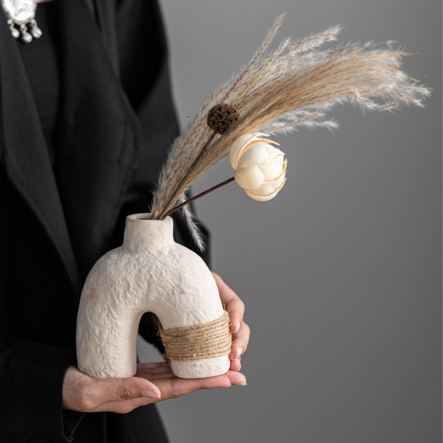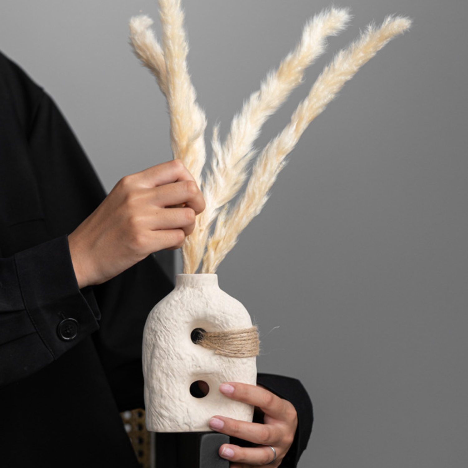 Cada florero presenta una forma abstracta y contemporánea, ideal para realzar la decoración de mesas, estantes, libreros o dormitorios. Su boca de líneas suaves permite colocar flores naturales o secas, convirtiéndolos en piezas versátiles tanto para el uso decorativo como funcional.