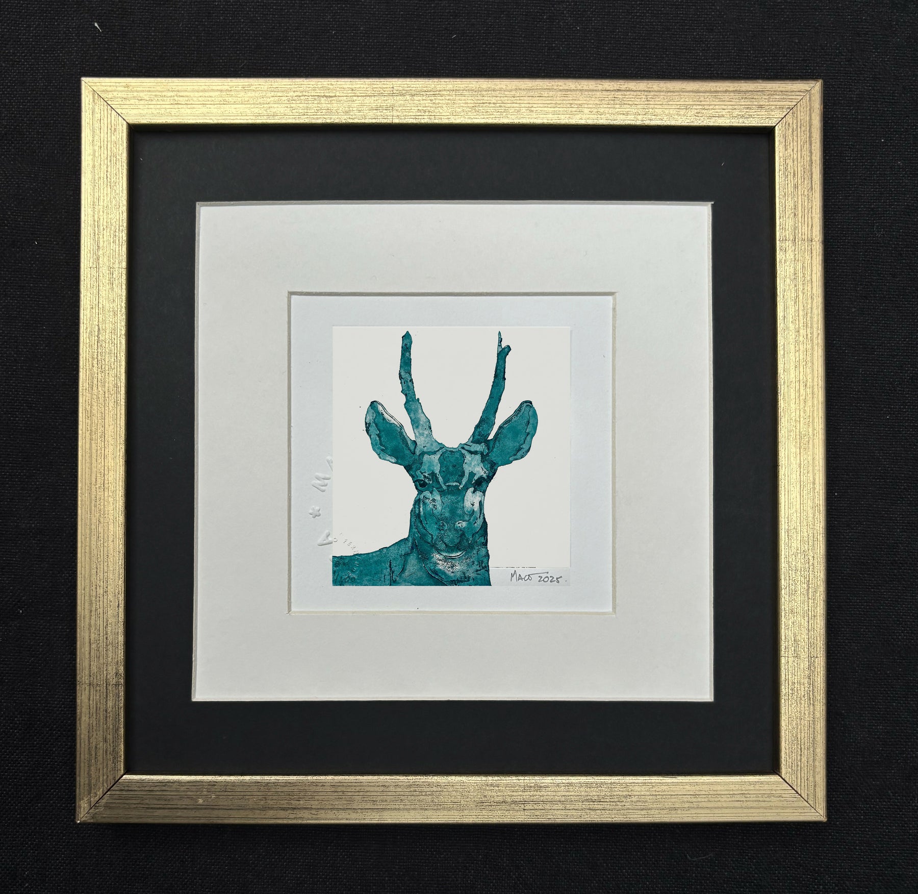 Enmarcación: vidrio normal, paspartú negro y marco liso dorado.