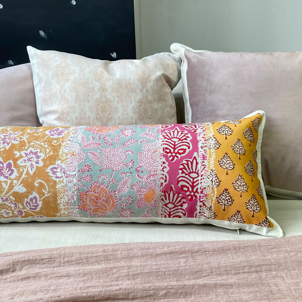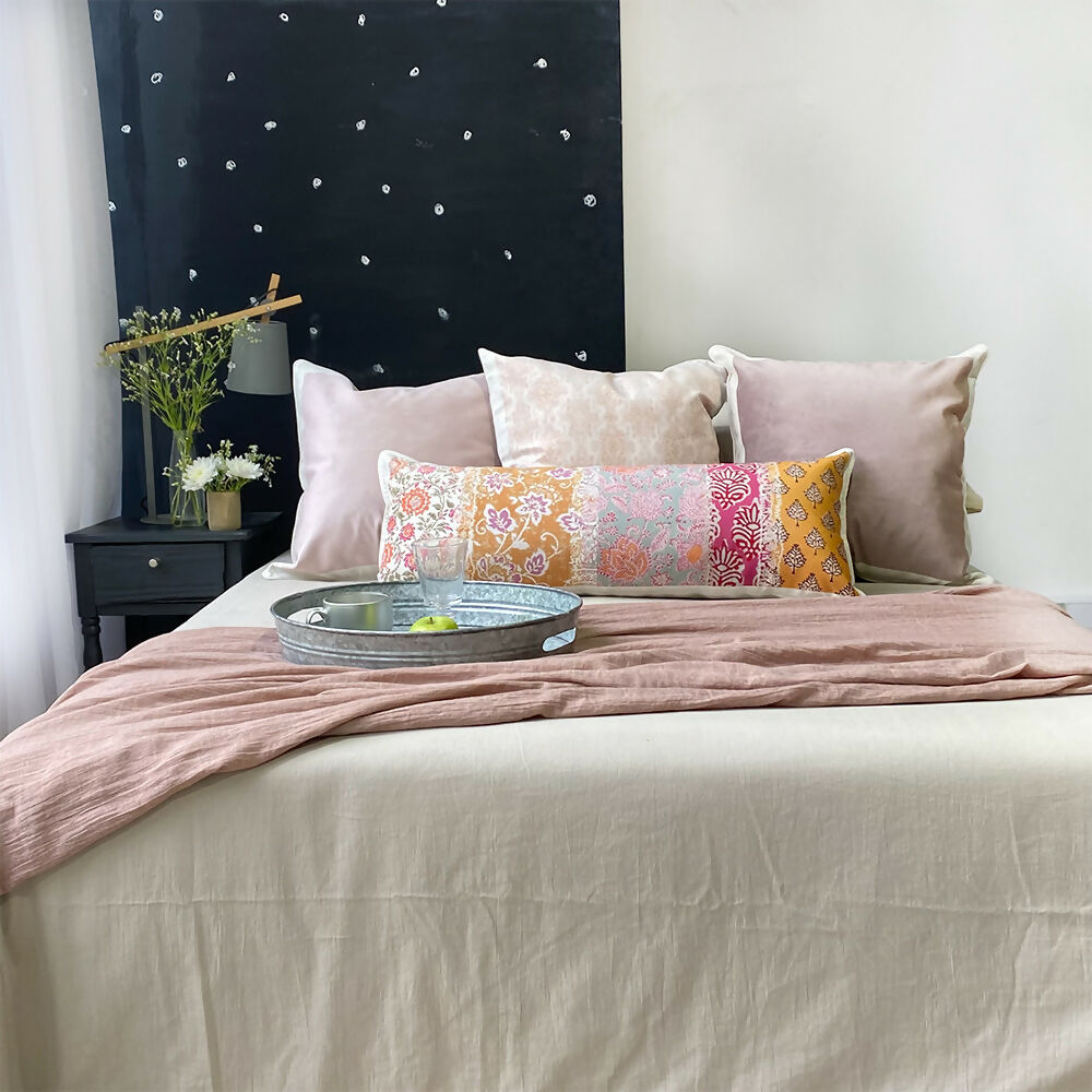 Cojín Boheme en velvet crudo, 100 x 40 cm. estampado.