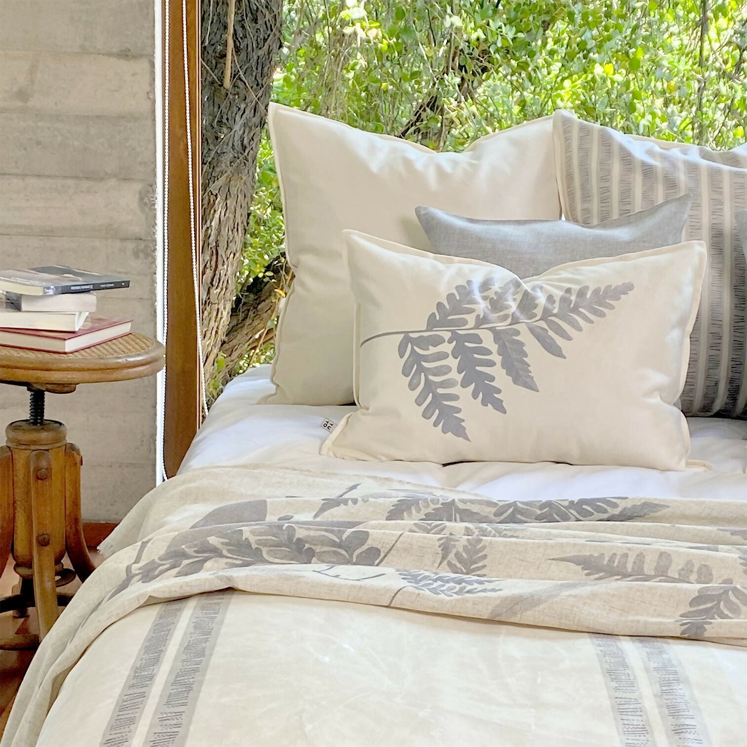 Cojín Bosque Helecho en velvet crudo, 60×40 cm. estampado.