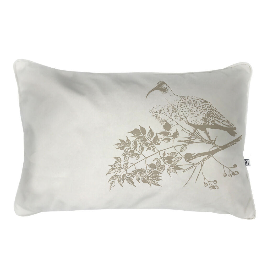 Cojín Nativo Bandurria en velvet crudo, 60×40 cm. estampado.