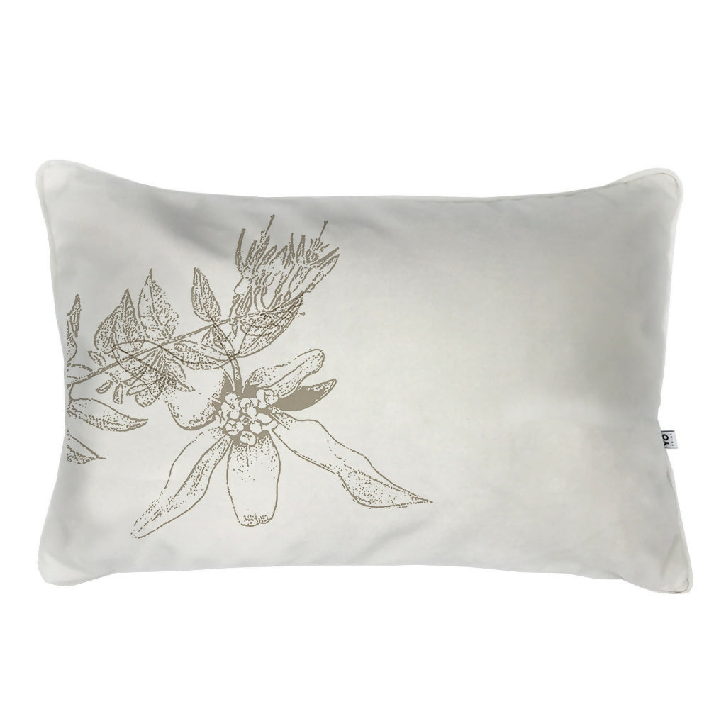 Cojín Nativo flor en velvet crudo, 60×40 cm. estampado.