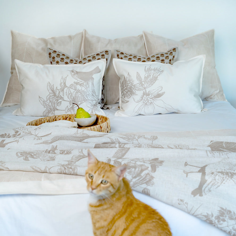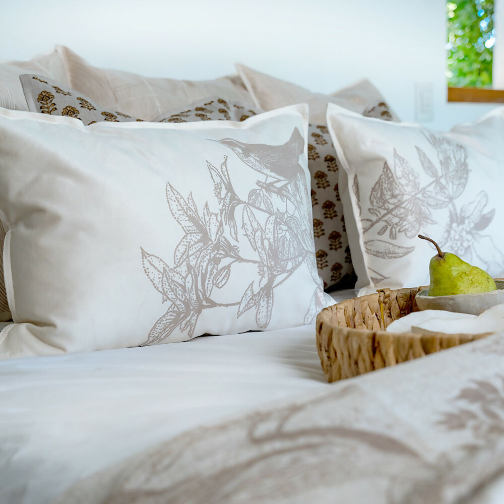 Los cojines de la Colección Nativo son el reflejo de la sofisticación y la belleza. Basada en ilustraciones de flora y aves nativas, estos cojines se verán preciosos en tú cama o en un sofá, junto a la manta estampada de la Colección.