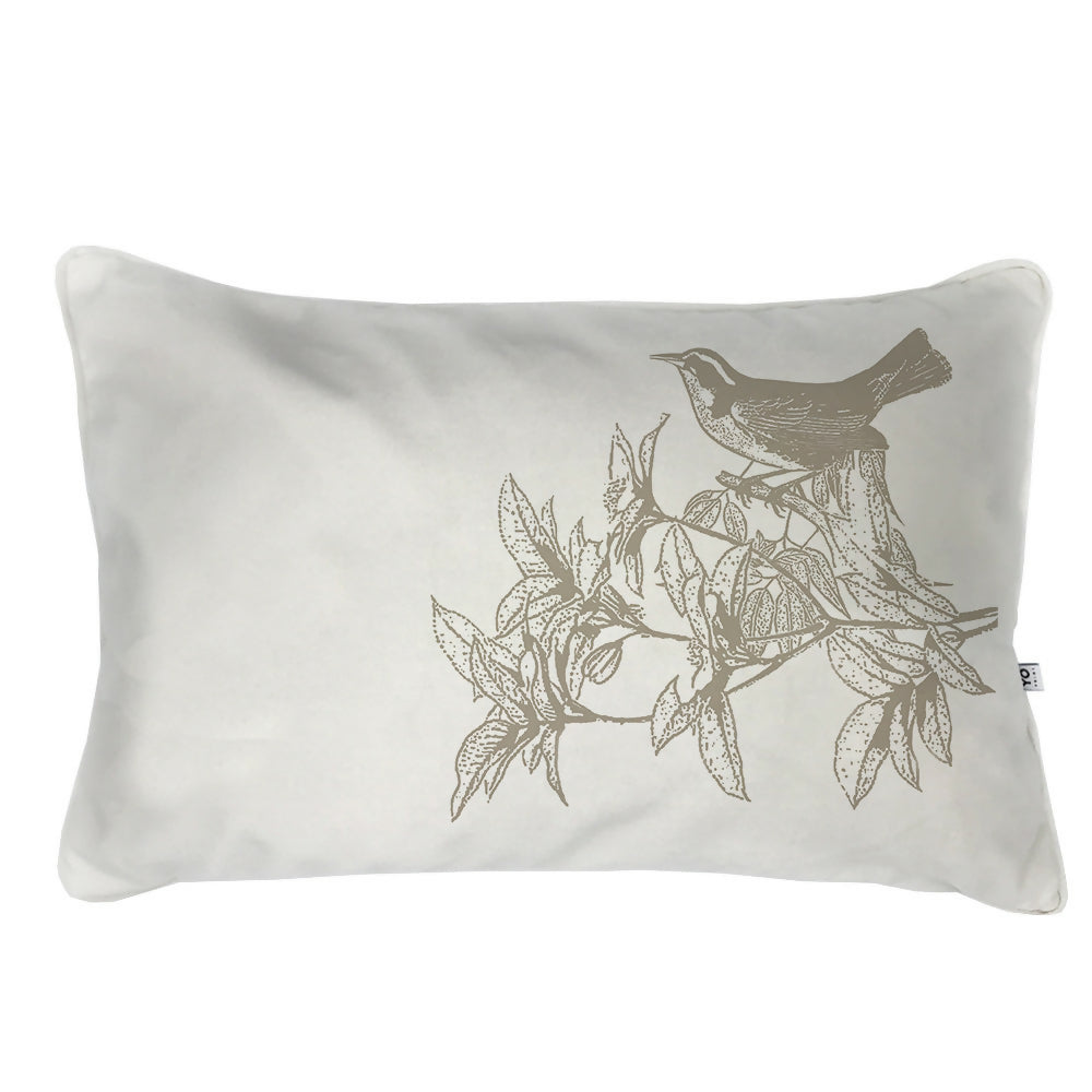 Cojín Nativo Loica en velvet crudo, 60×40 cm. estampado.