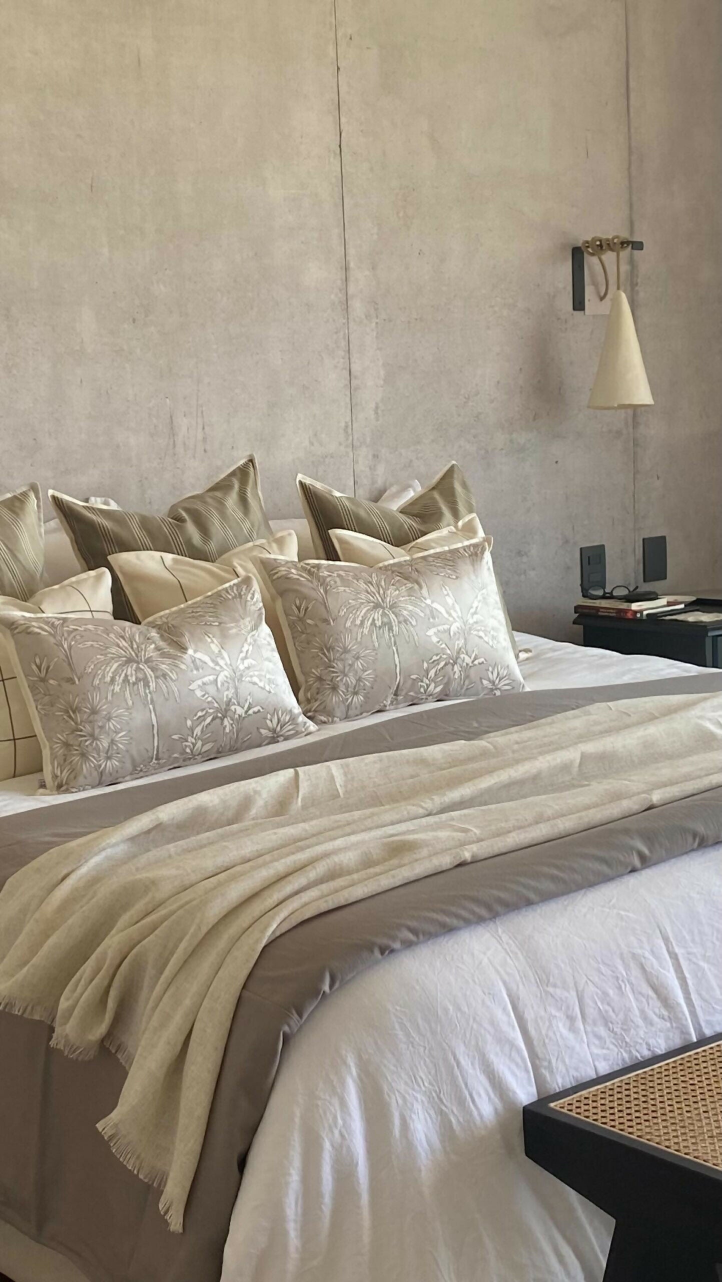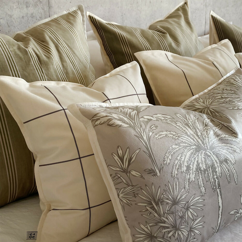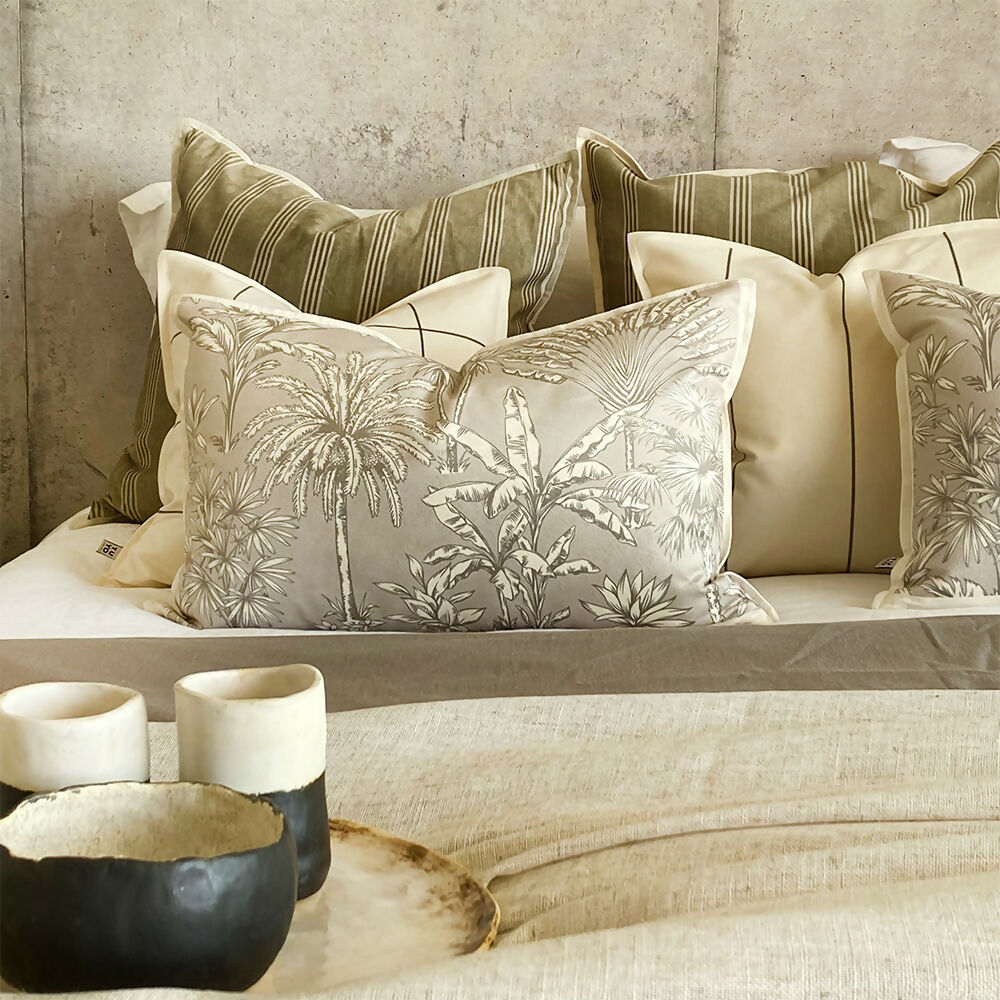 Cojín Palm - en velvet crudo, 60×40 cm. estampado.