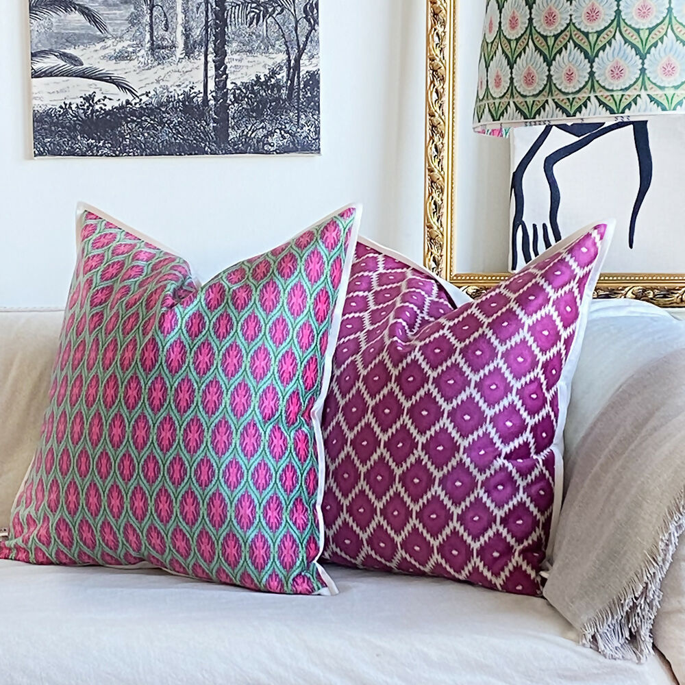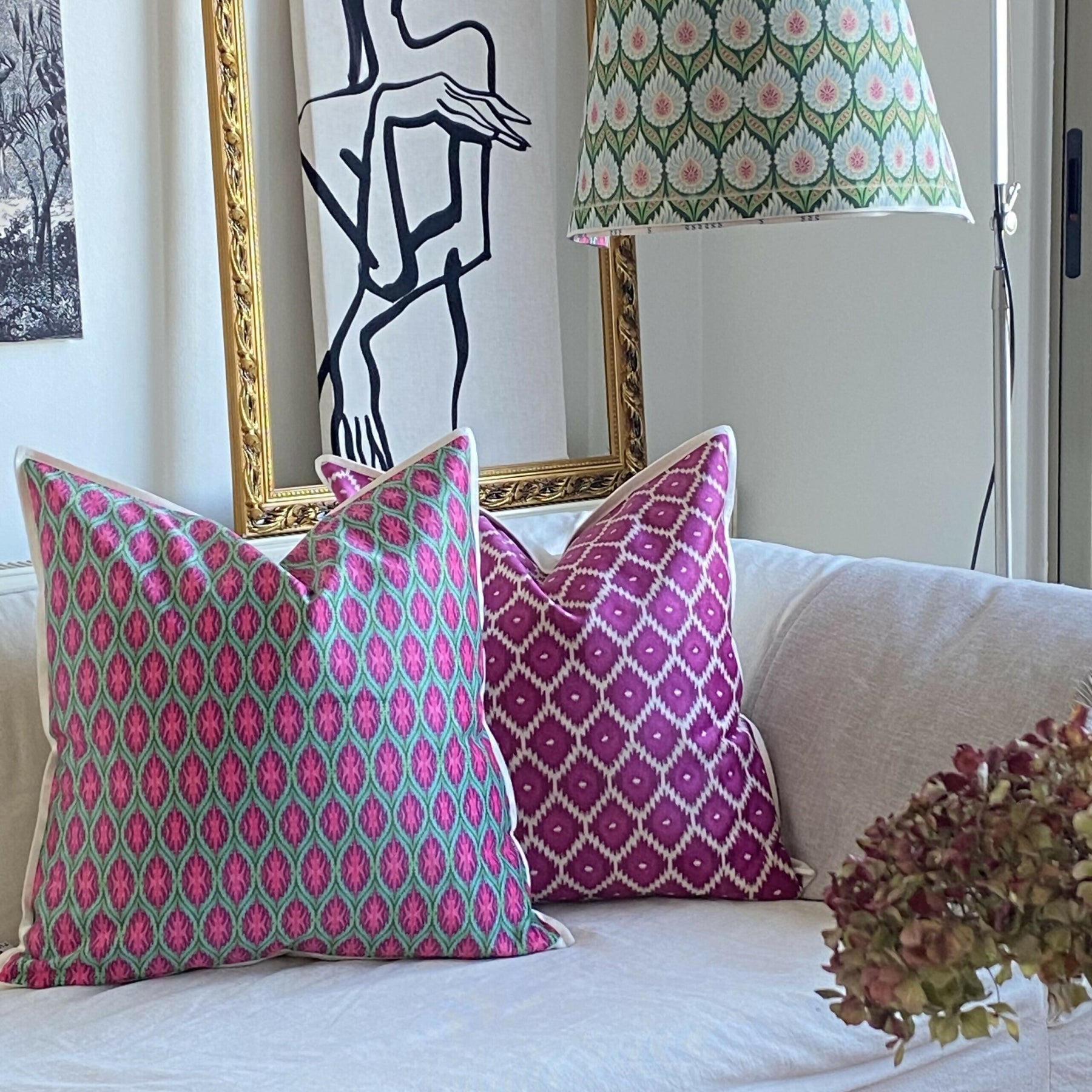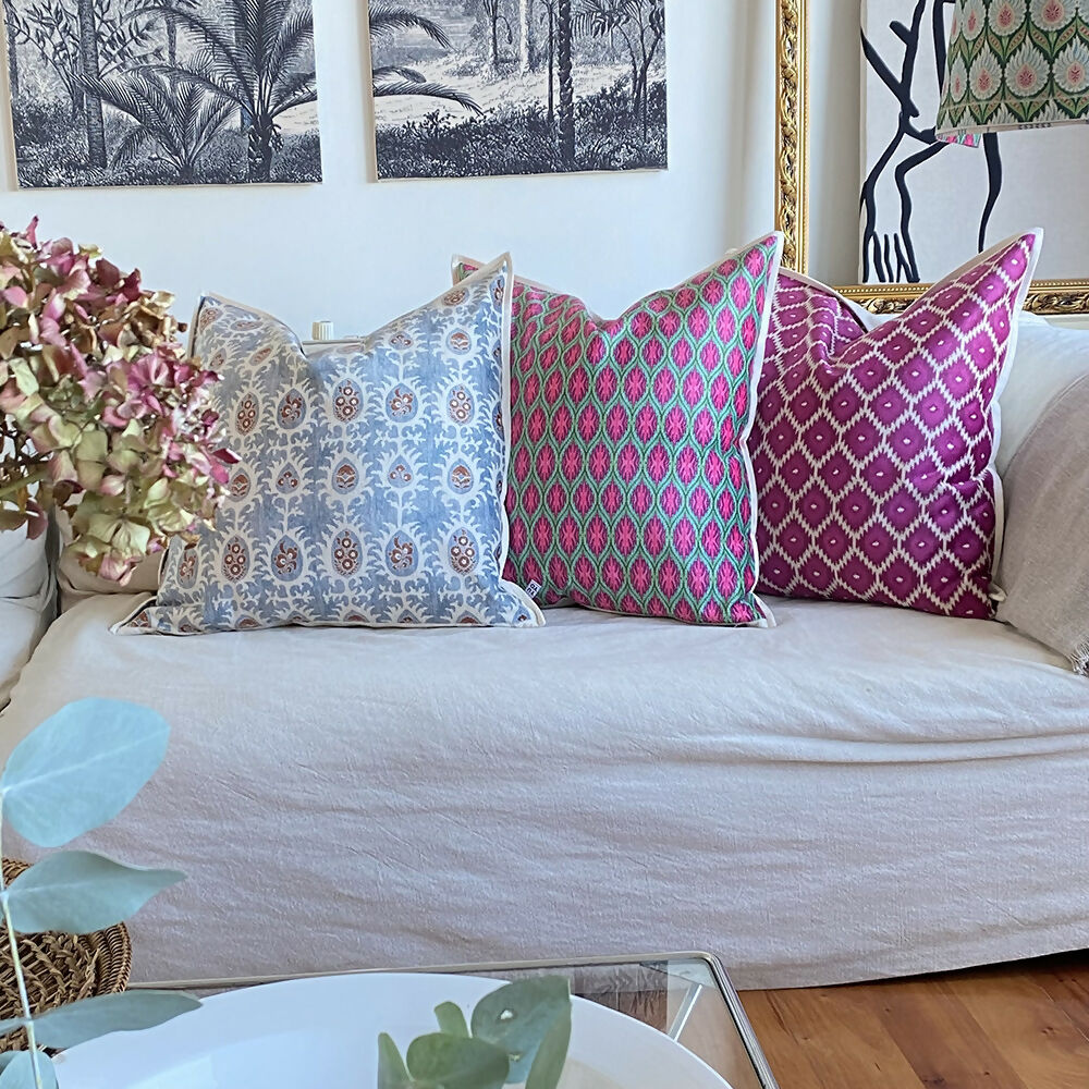 Exquisito cojín en Velvet crudo estampado de grandes dimensiones.