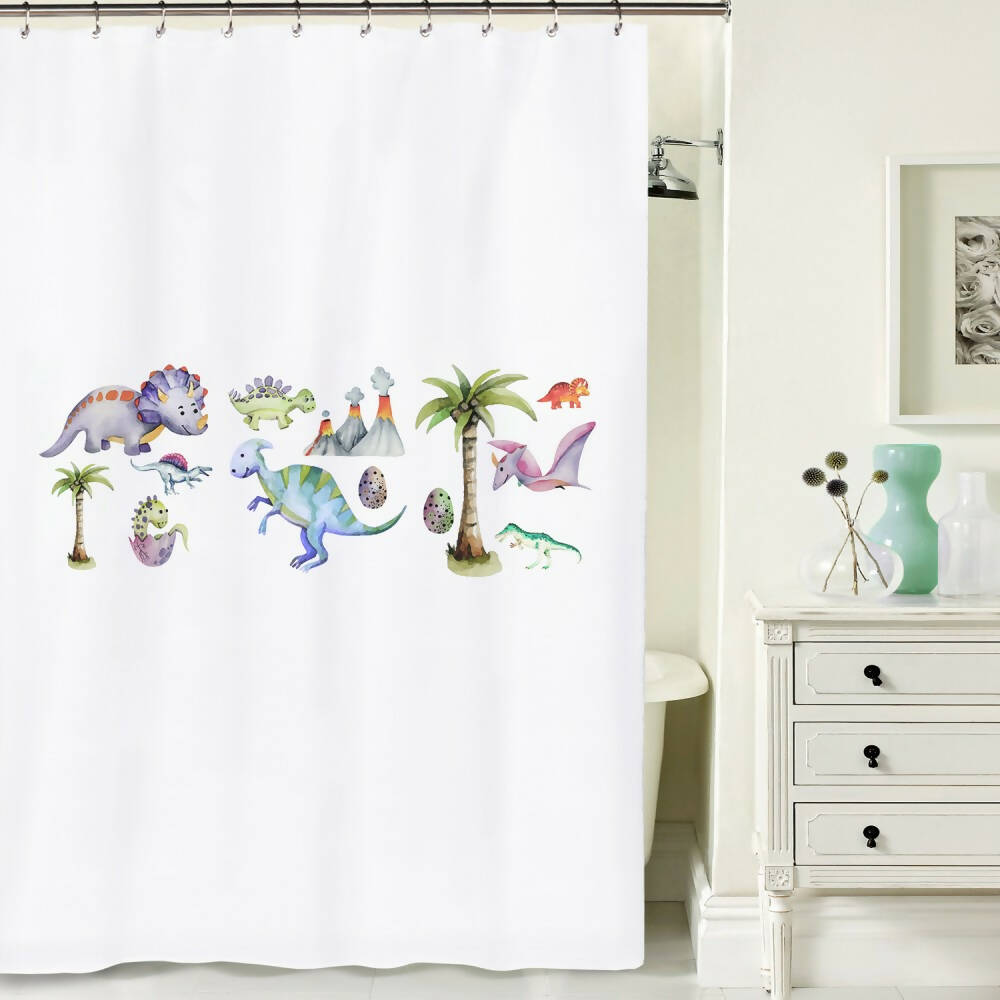 Cortina de Baño Dinosaurio elaborada en algodón blanco 180 x 180 cm.