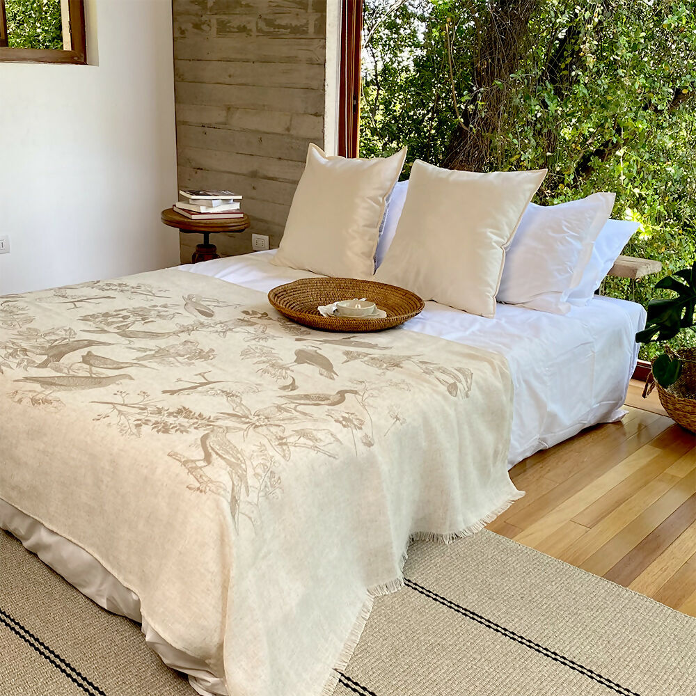 Nuestro Plaid de gasa estampada con diseño de pájaros nativos de Chile fusiona con elegancia la funcionalidad con la expresión versátil, cada hilo tejido y estampado captura la majestuosidad y diversidad de las aves chilenas, aportando a cualquier espacio una sofisticación única.