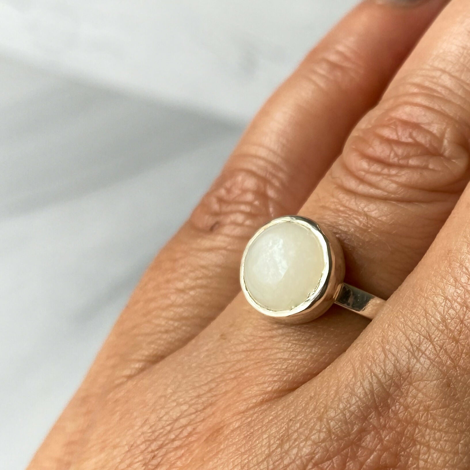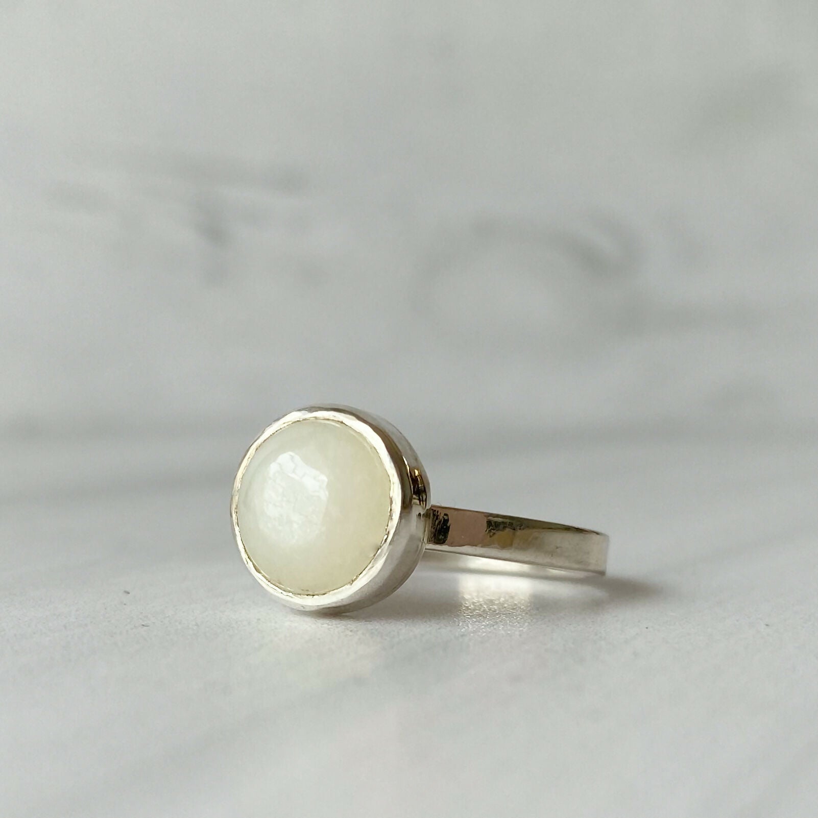 Anillo de línea pura de plata 950 abraza con suavidad una Selenita, piedra delicada, conocida por su energía serena y luminosa.