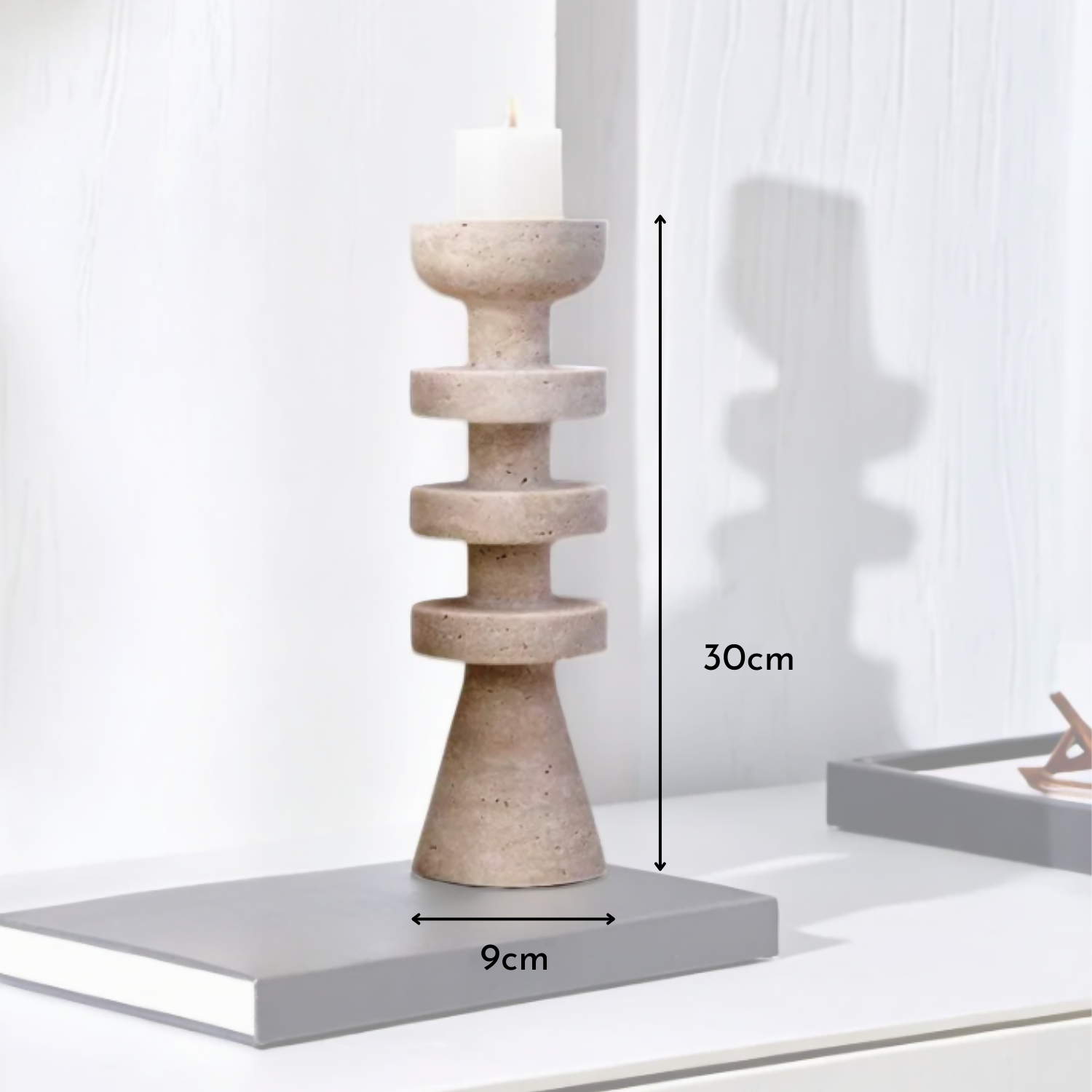 Con un diseño inspirado en las formas arquitectónicas y escultóricas, esta pieza ofrece tres niveles de altura en su estructura y una parte superior funcional como soporte para velas, ideal para velas tipo pilar o decorativas. Elaborado en material tipo piedra, su textura aporta calidez, profundidad visual y un estilo natural y contemporáneo a la decoración.
