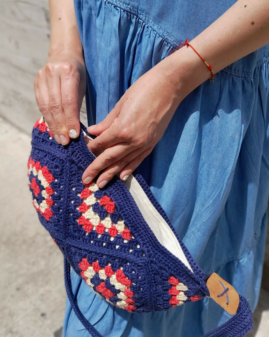 Esta cartera tejida a mano en 100 % algodón con un diseño moderno y versátil. Su patrón estilo granny square, elaborado en tonos vibrantes azul, sandía y beige, crea un patrón único que aporta frescura, color y personalidad a cualquier look con un toque fresco y original que destaca en cualquier ocasión.