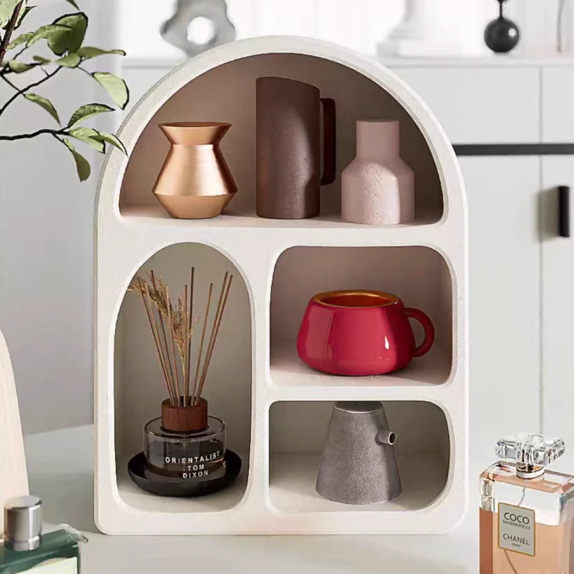 Con 4 nichos de almacenamiento, este estante ofrece espacio suficiente para organizar y exhibir tazas, velas, libros, accesorios o pequeños electrodomésticos. Su diseño limpio, sin detalles recargados, lo convierte en un complemento versátil, ideal para la cocina, sala, dormitorio, estudio o espacios más pequeños que necesitan orden con estilo.