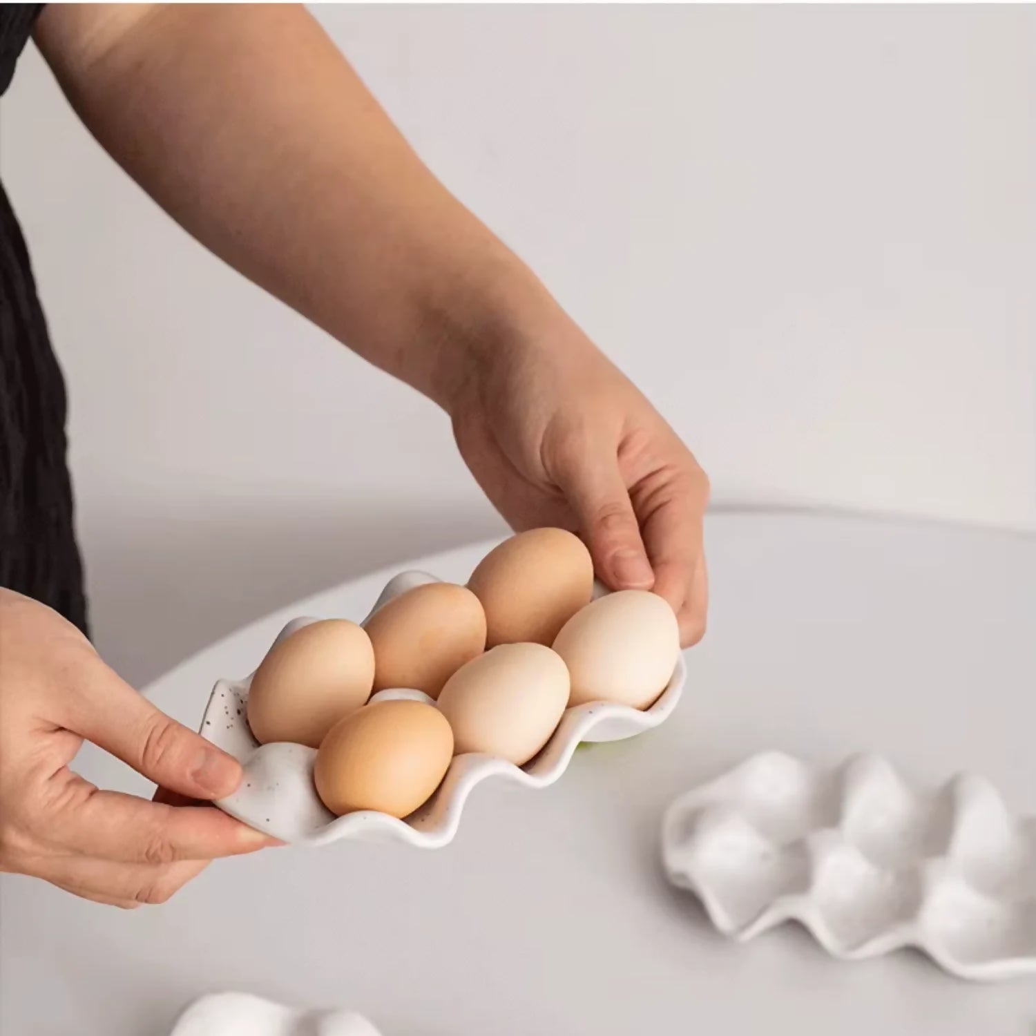 Fabricada en cerámica de alta calidad, esta bandeja porta huevos presenta un diseño limpio y contemporáneo que luce perfecta a la vista, ya sea sobre la encimera, la mesa del desayuno o una repisa. Cada espacio está cuidadosamente moldeado para mantener los huevos firmes y seguros, evitando que rueden o se golpeen entre sí.
