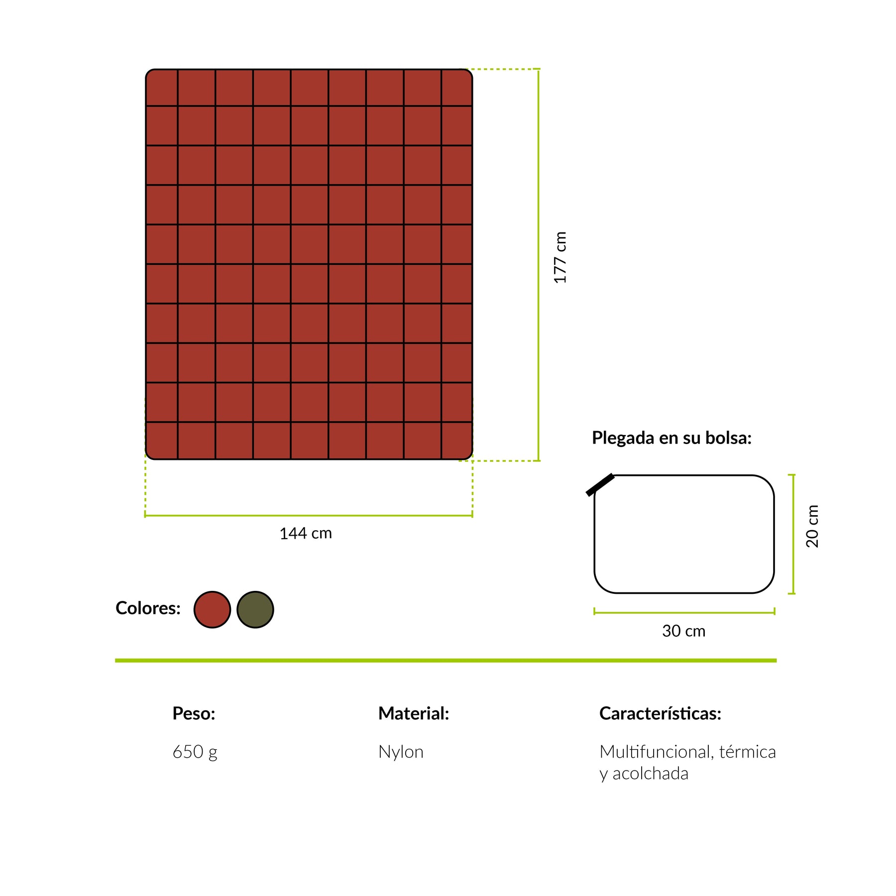 - Plegada en su bolsa: 31 x 22 x 10 cm - Peso: 690 g