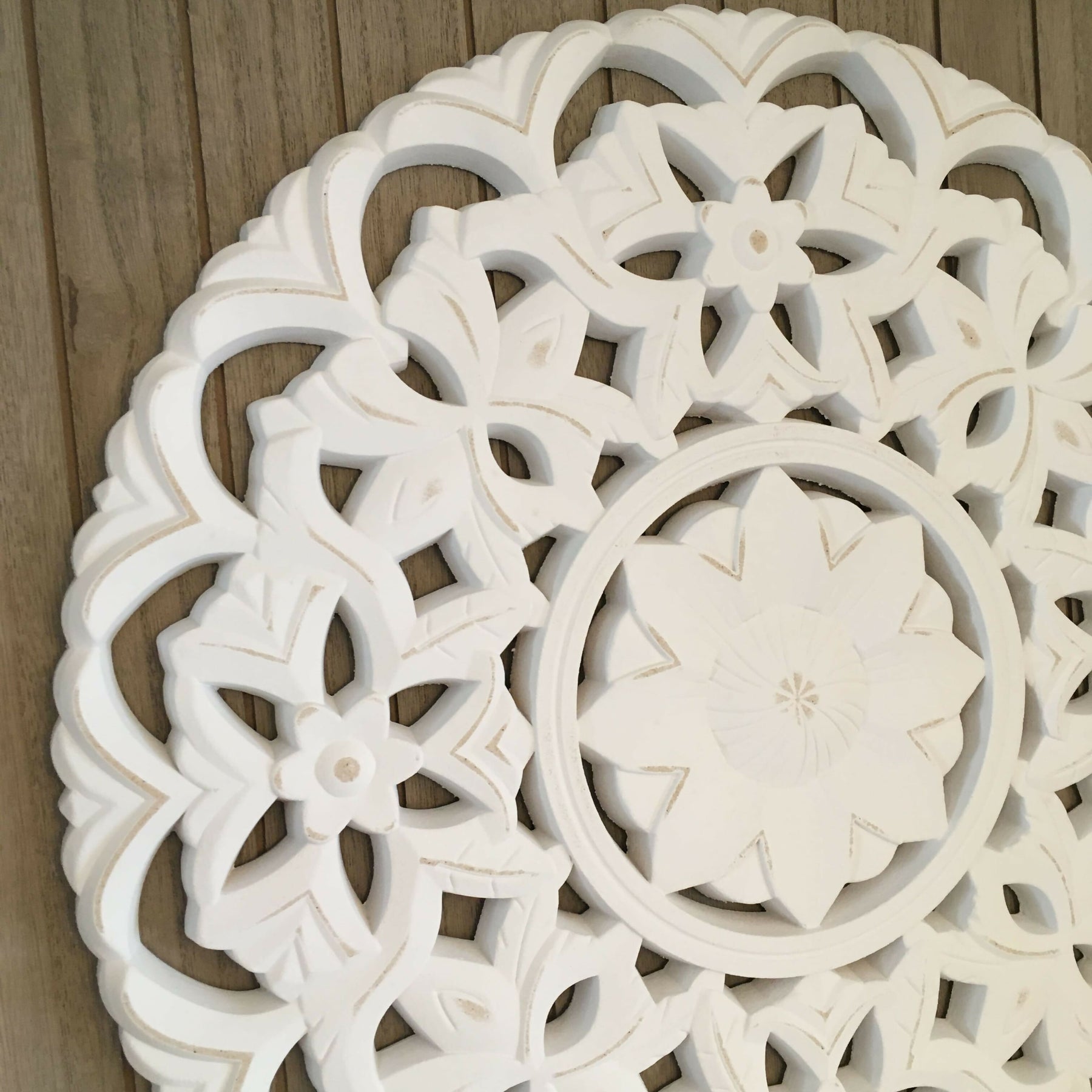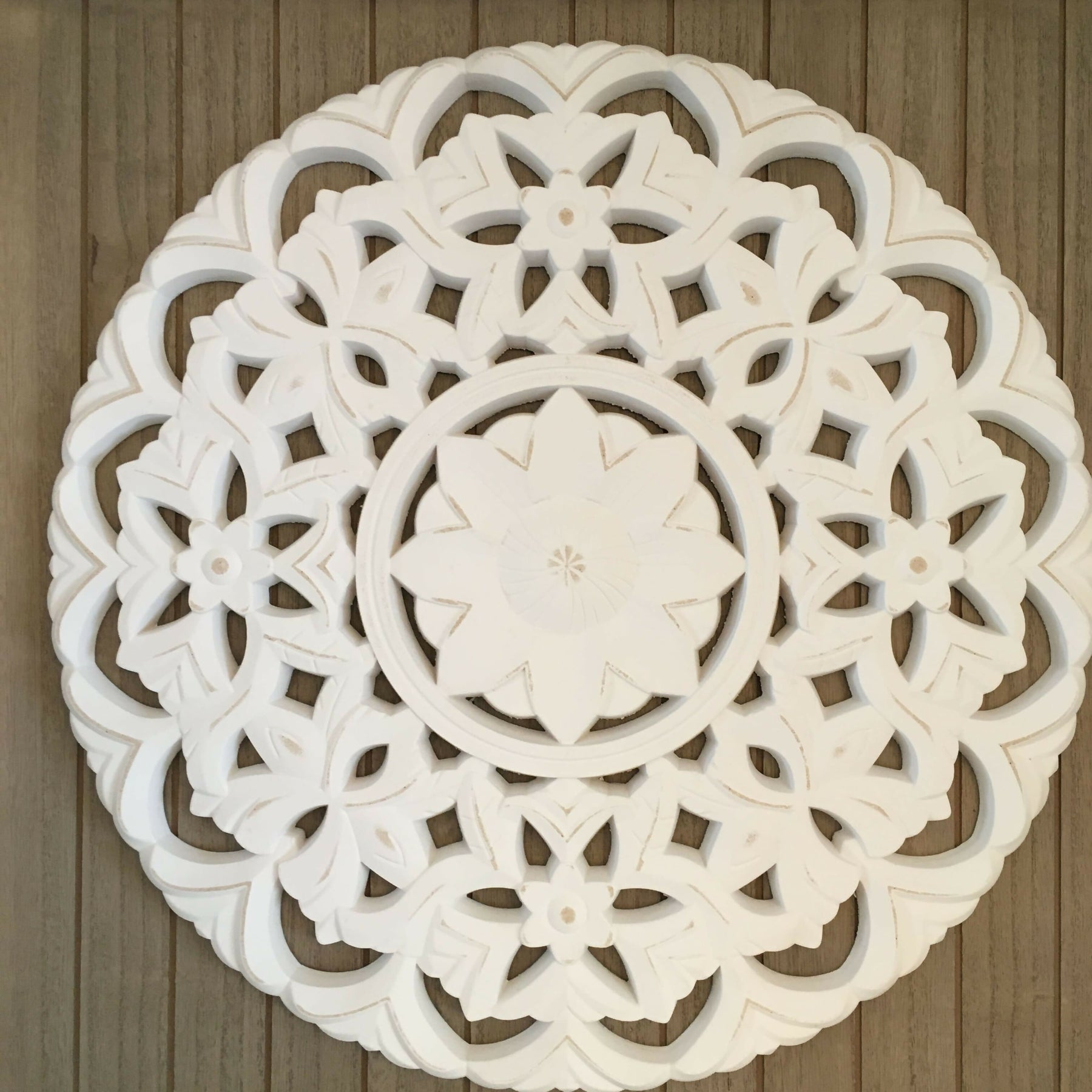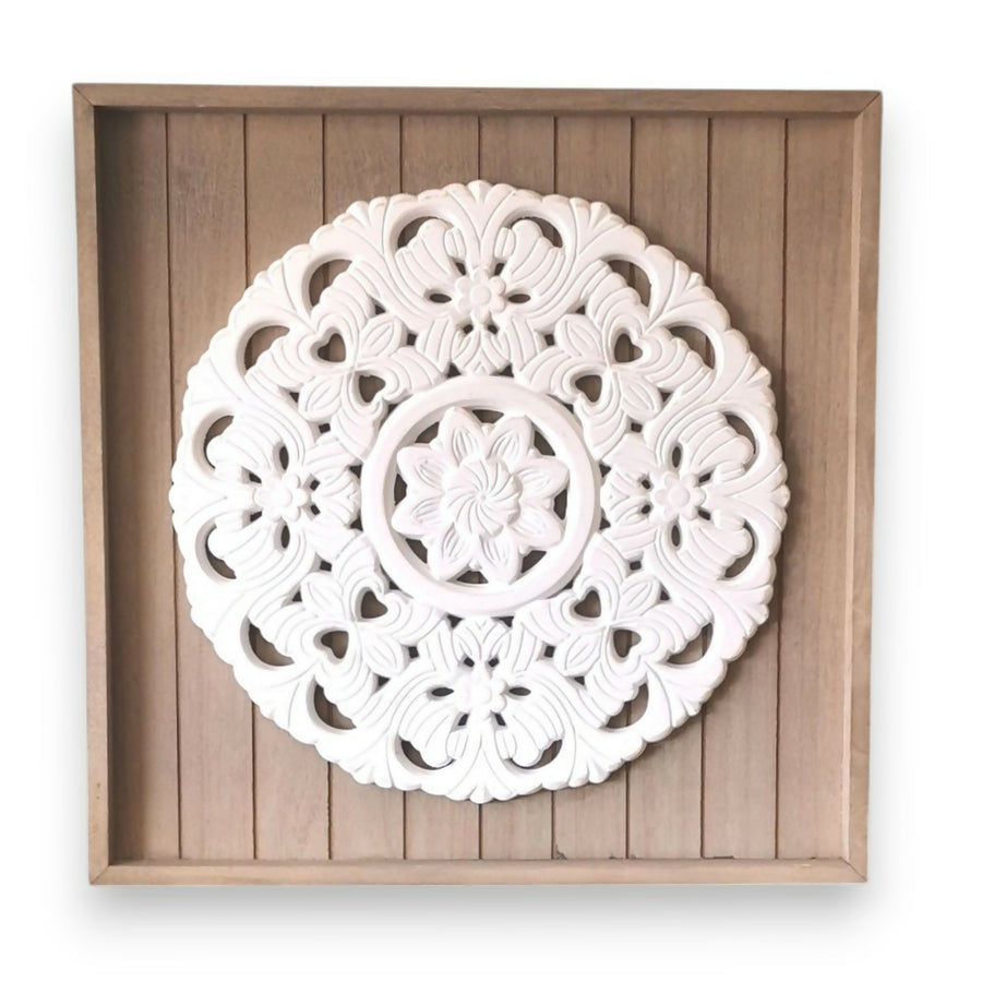 Mándala redondo color blanco con motivos diseños simétricos sobre base madera cuadrada. Tamaño relevante para decoración pared de estar o living. Se pueden pintar previamente. Tamaño: 58 x 58 x 3 cm.