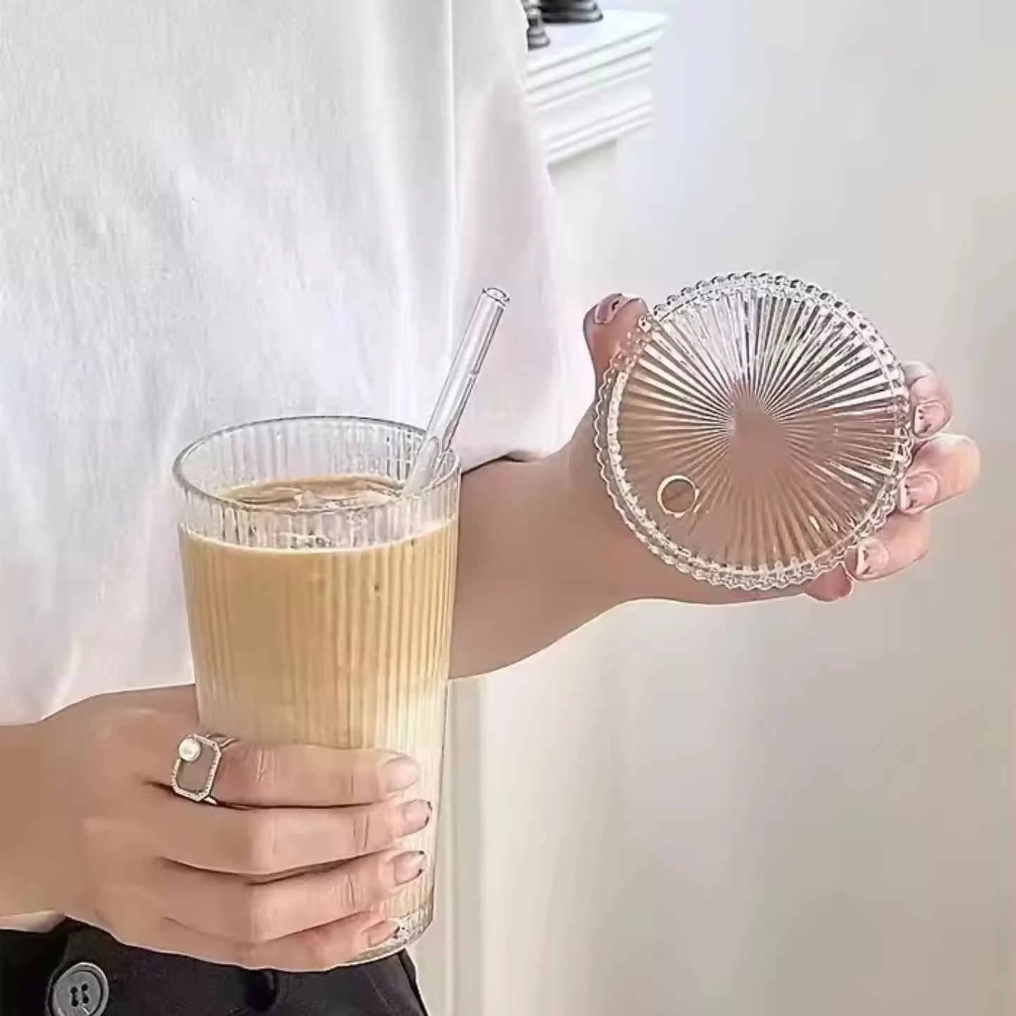 Nuestro Vaso de Vidrio con Bombilla y Tapa con Líneas de 380ml y diseñado sin mango, es ideal para café, jugos, leche moca, cerveza y más. Perfecto para desayunos, festivales, aniversarios y cumpleaños, este vaso combina estilo minimalista y funcionalidad.